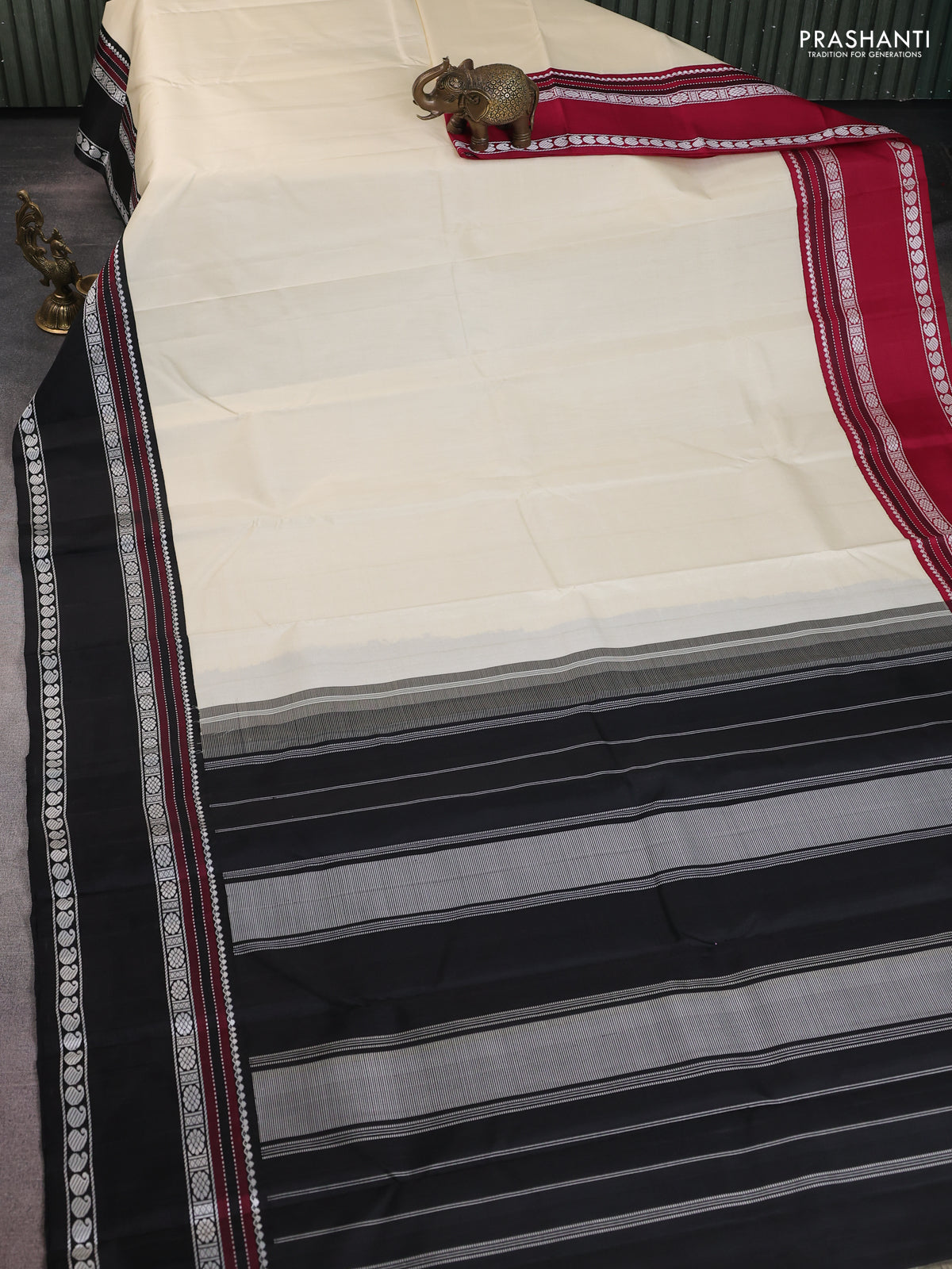 Pure kanchipuram silk saree cream with plain body and ganga jamuna border