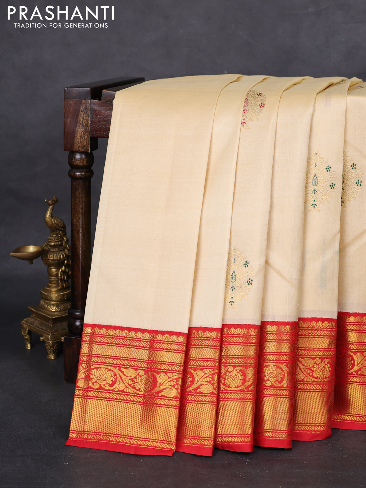 Pure kanchipuram silk saree cream with zari woven buttas and ganga jamuna border