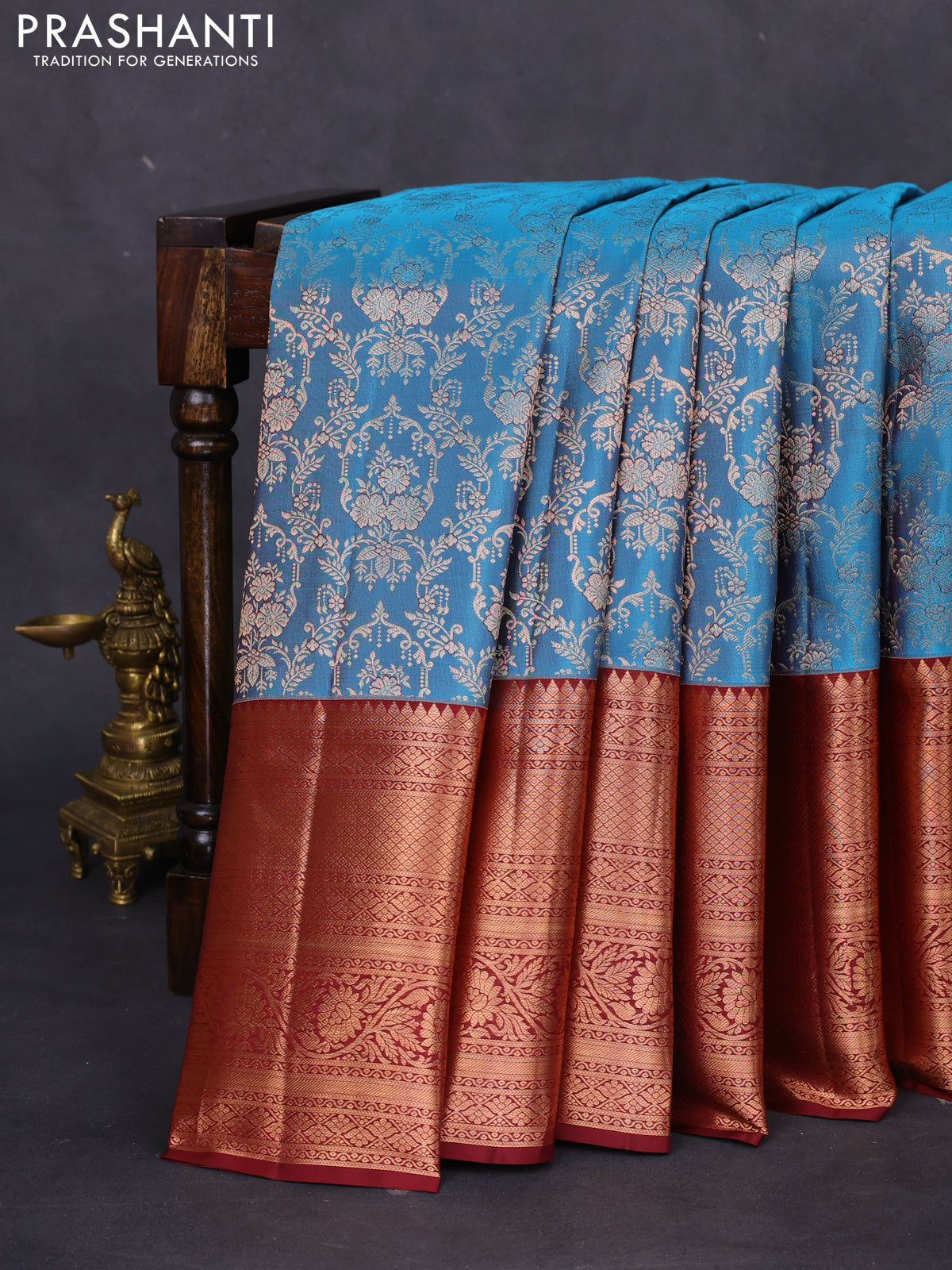 Pure kanchipuram silk saree cs blue and deep maroon with allover zari woven brocade weaves and long copper zari woven border