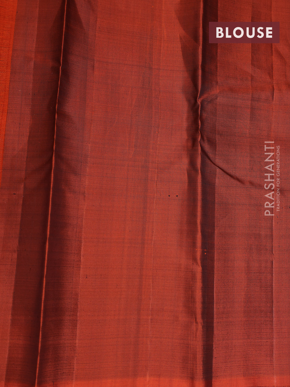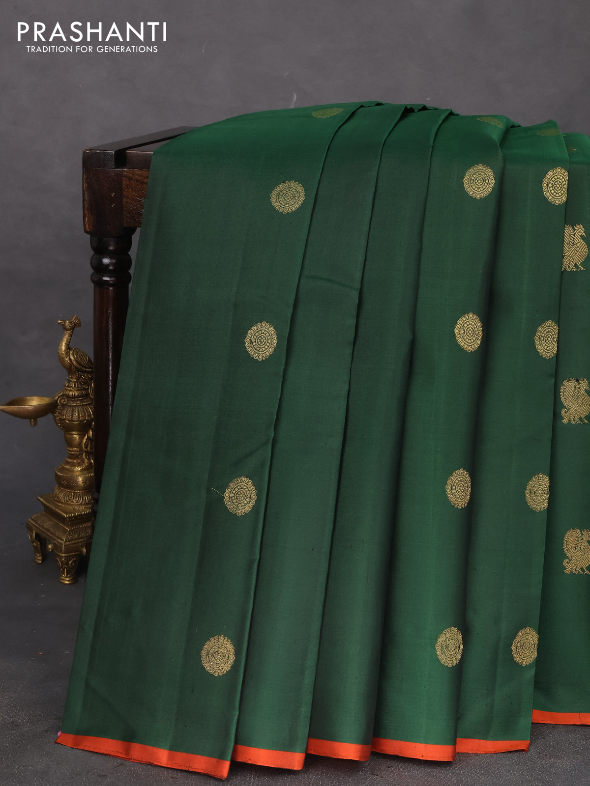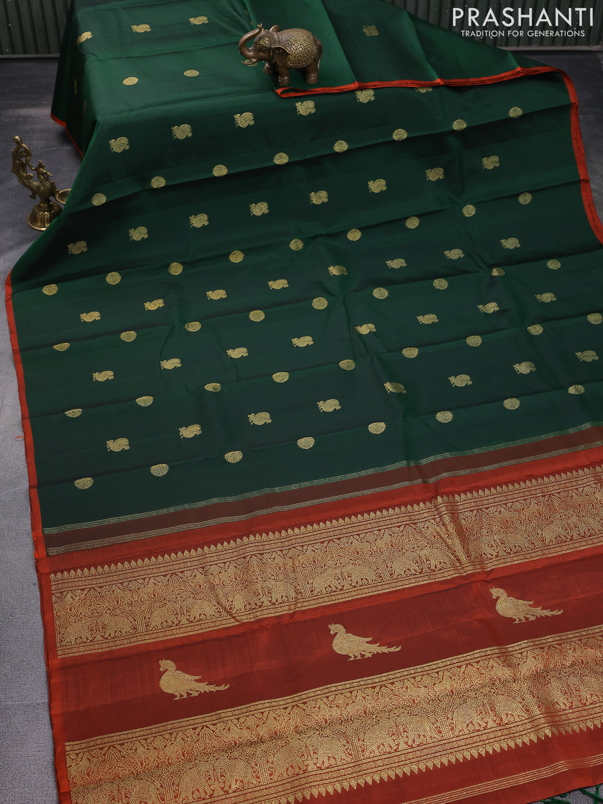 Pure kanchipuram silk saree dark green and rustic orange with annam & rudhraksha zari woven buttas and piping border