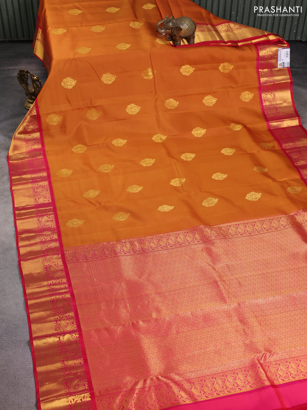 Pure kanchipuram silk saree dark mustard and pink with zari woven buttas and annam zari woven korvai border
