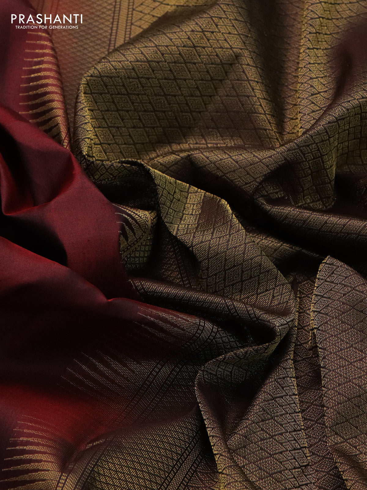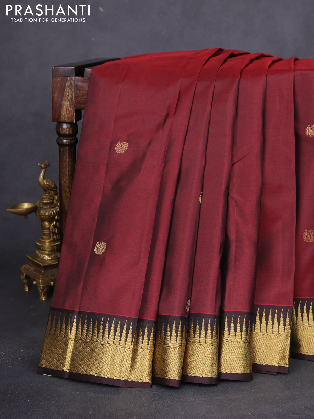 Pure kanchipuram silk saree deep maroon and coffee brown with zari woven annam buttas and temple zari woven border