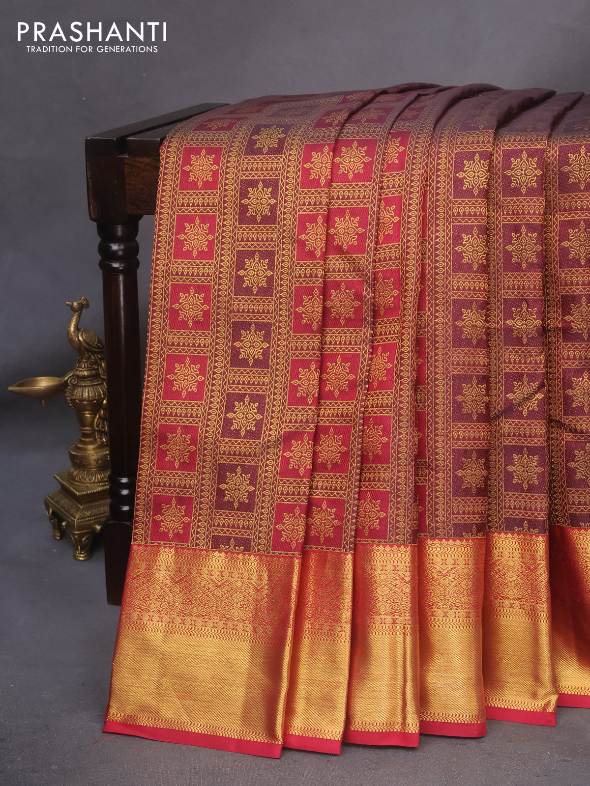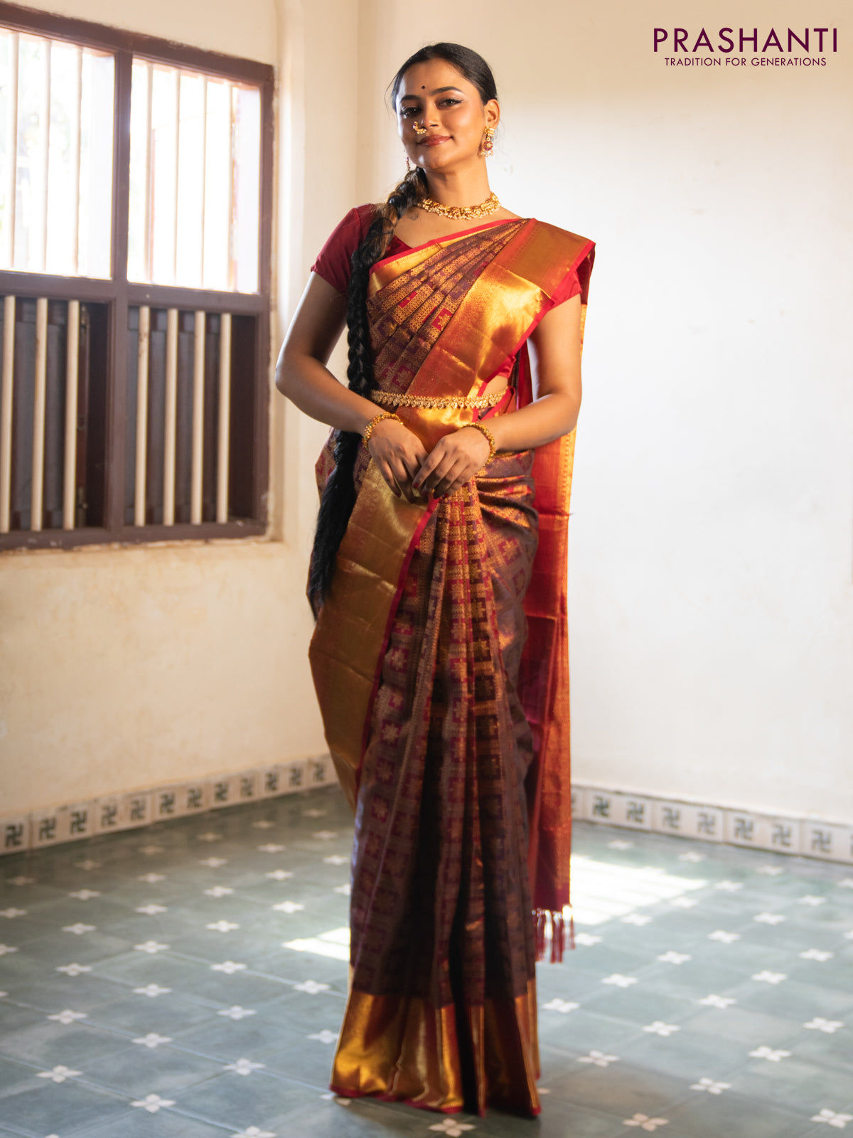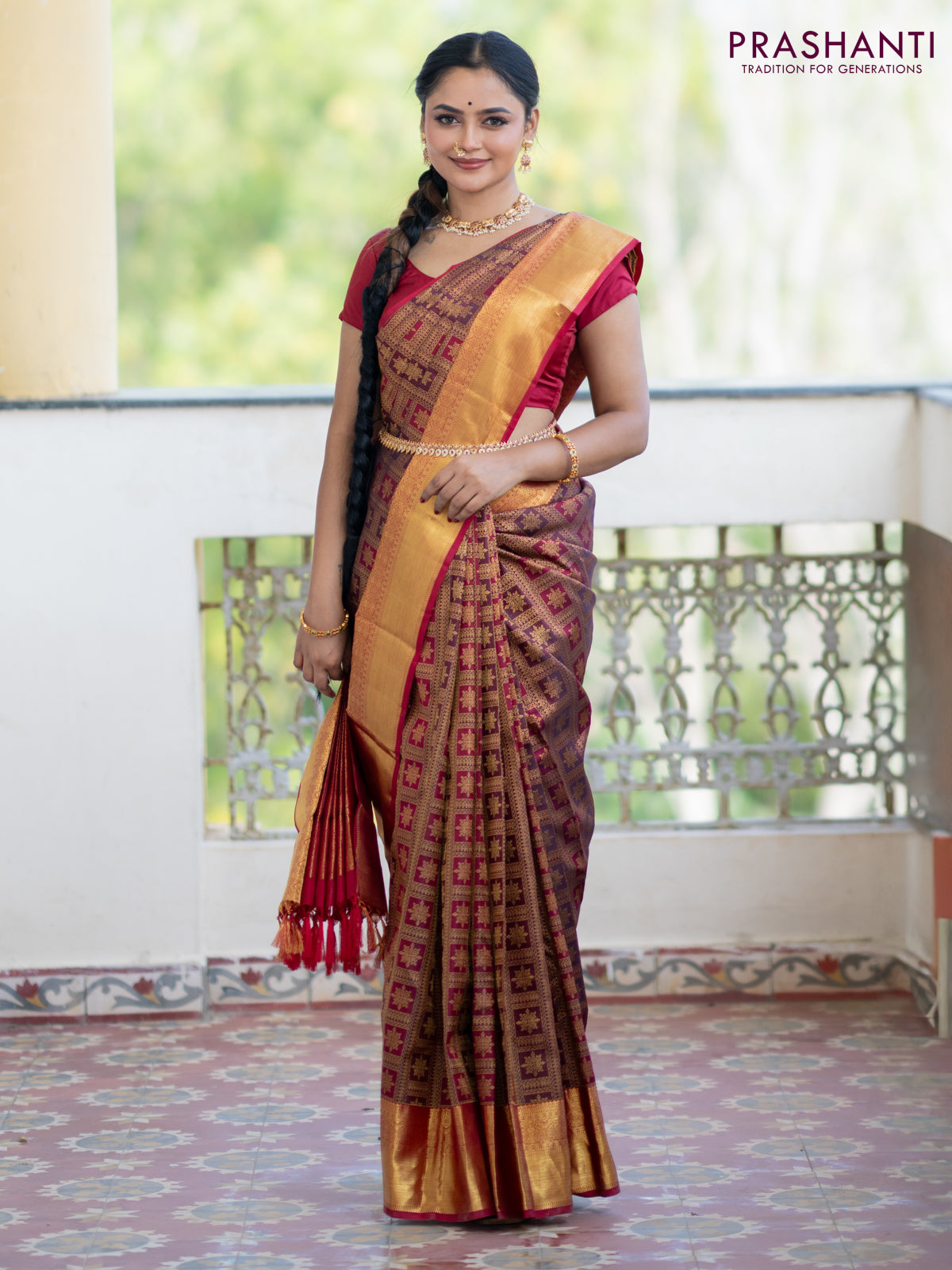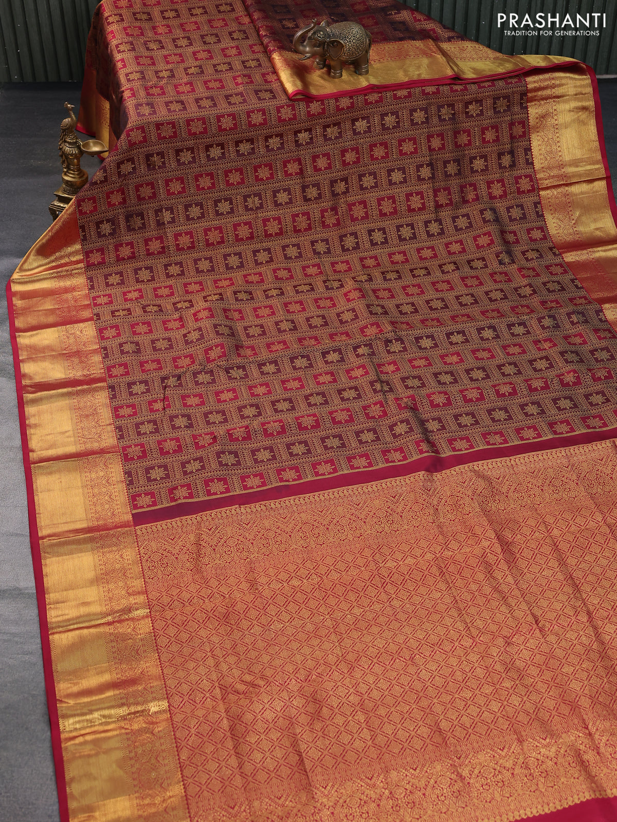 Pure kanchipuram silk saree deep maroon with allover zari woven brocade weaves and zari woven border