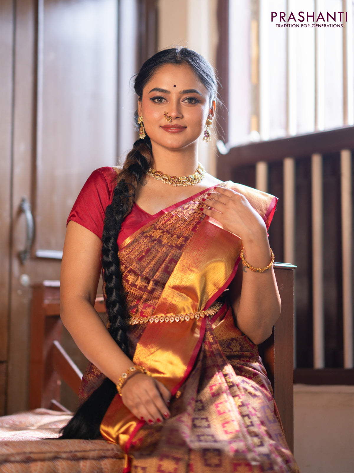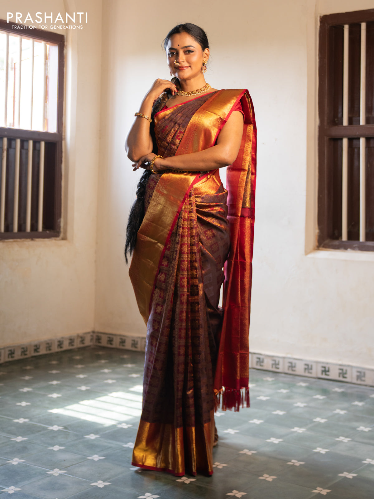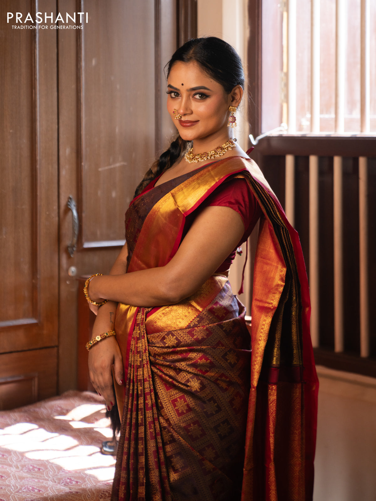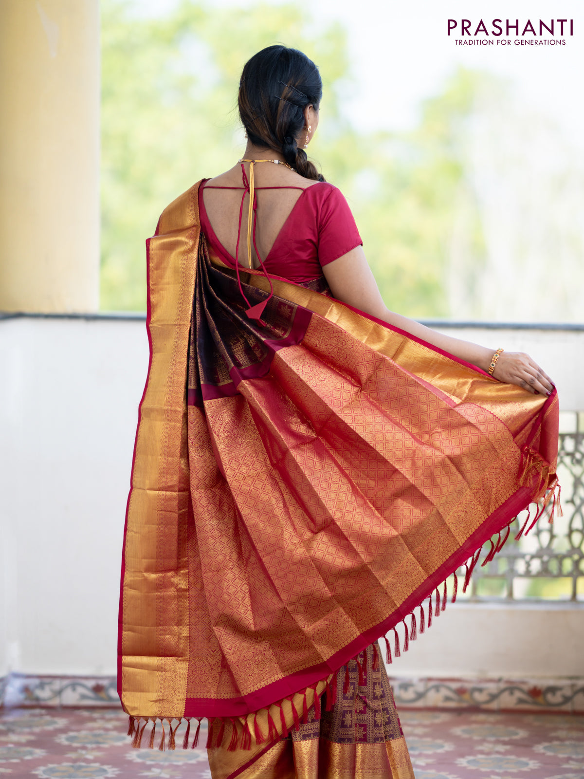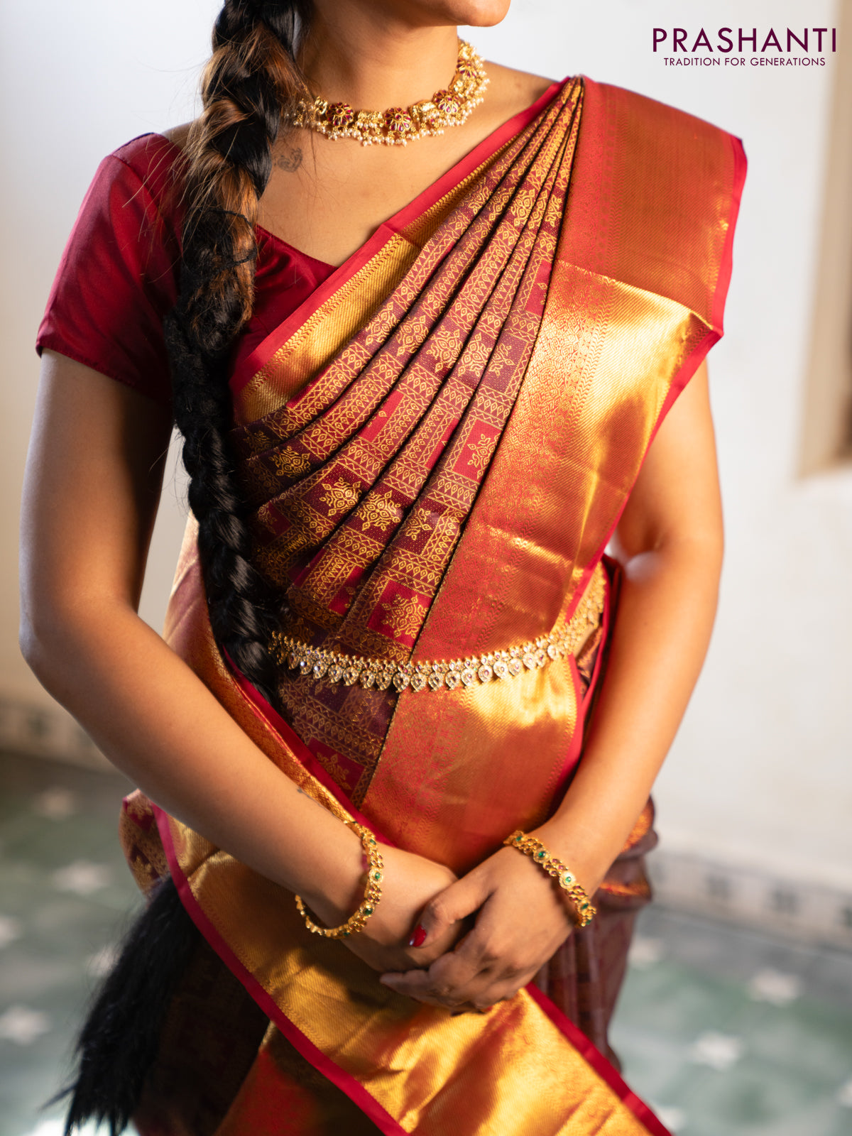Pure kanchipuram silk saree deep maroon with allover zari woven brocade weaves and zari woven border
