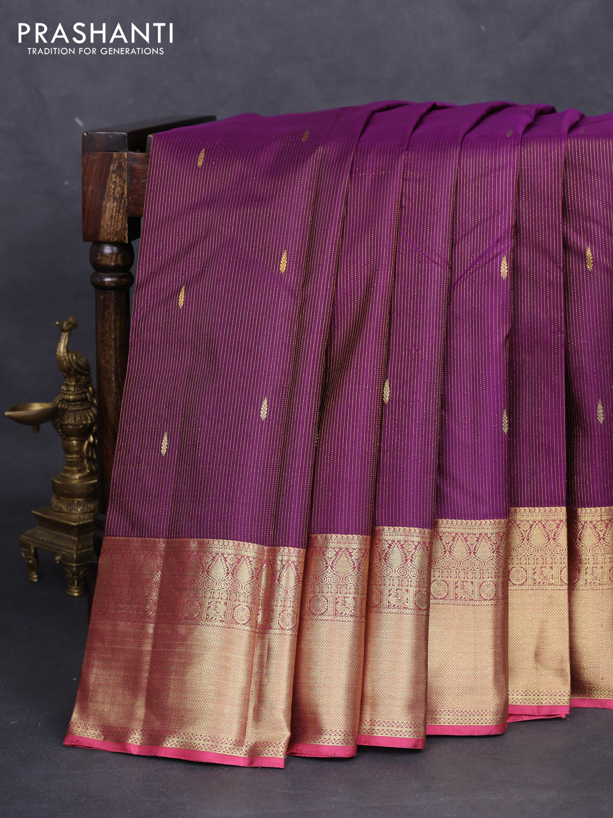 Pure kanchipuram silk saree deep purple and maroon with allover zari woven stripes pattern and zari woven border