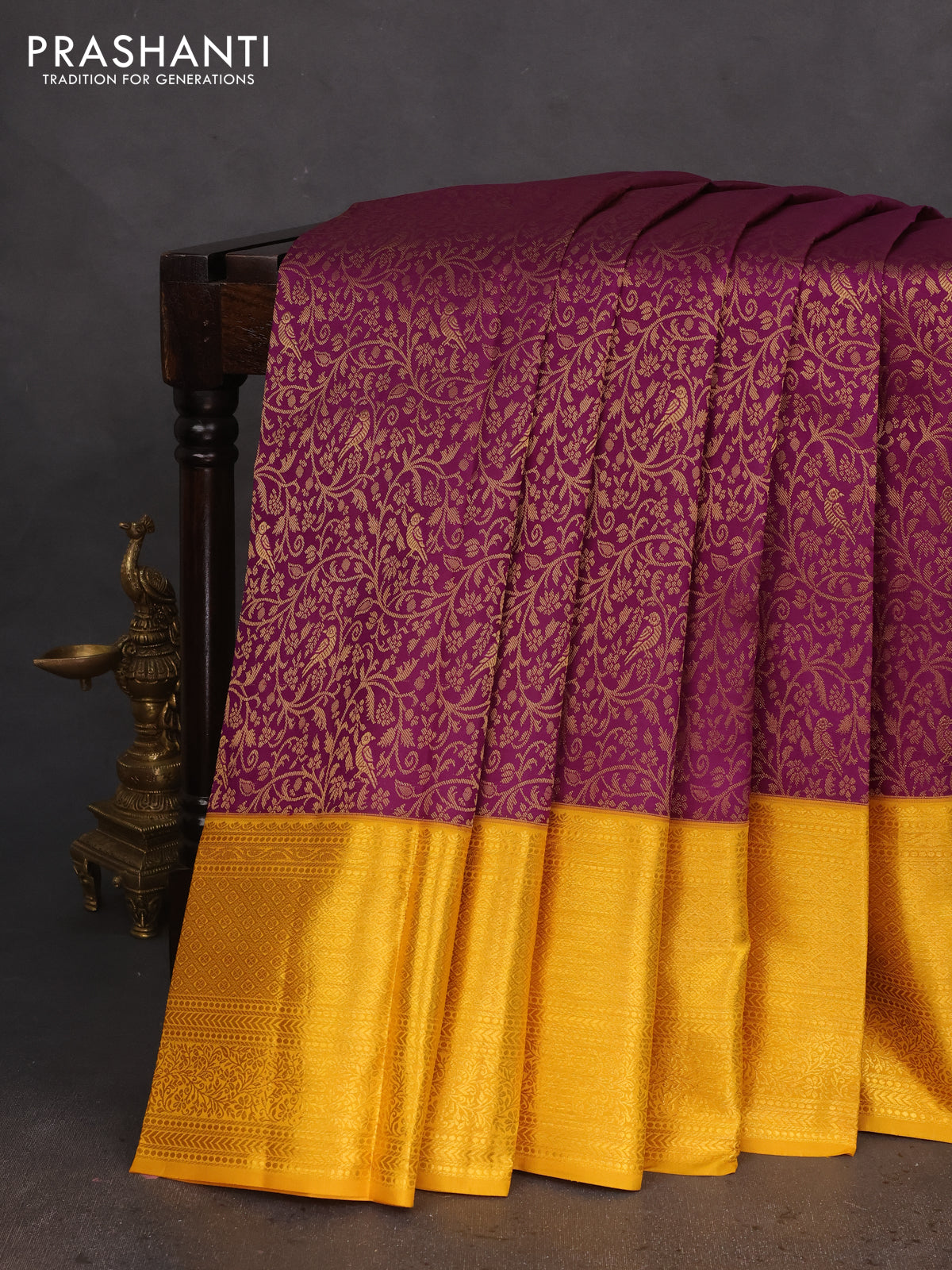 Pure kanchipuram silk saree deep purple and mustard yellow with allover zari woven brocade weaves and zari woven border