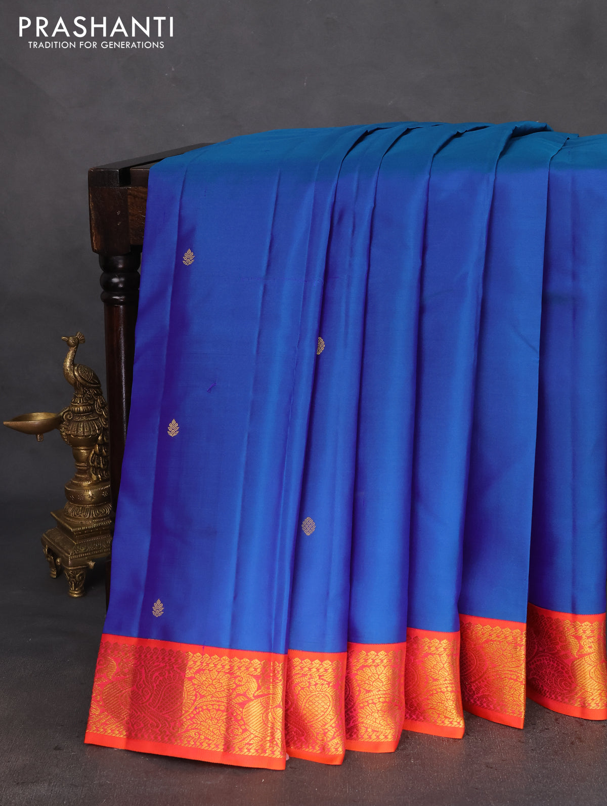 Pure kanchipuram silk saree dual shade of blue and orange with zari woven buttas and zari woven korvai border