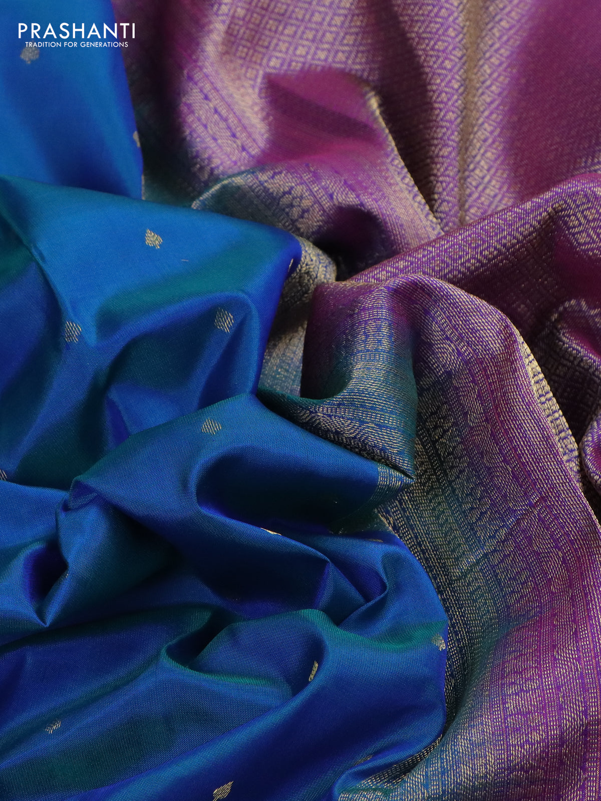 Pure kanchipuram silk saree dual shade of bluish green and purple with allover zari woven 1000 buttas and small zari woven border
