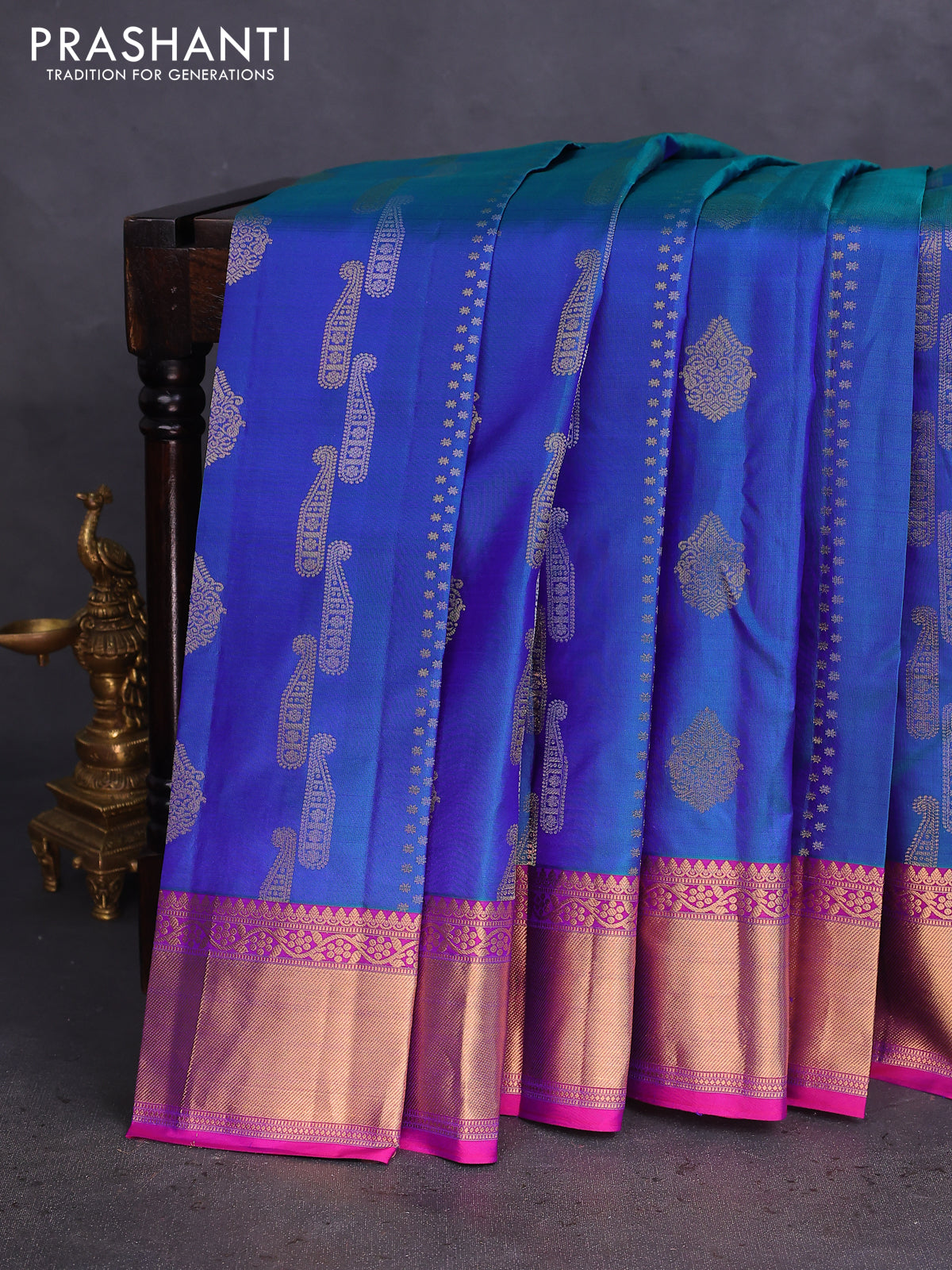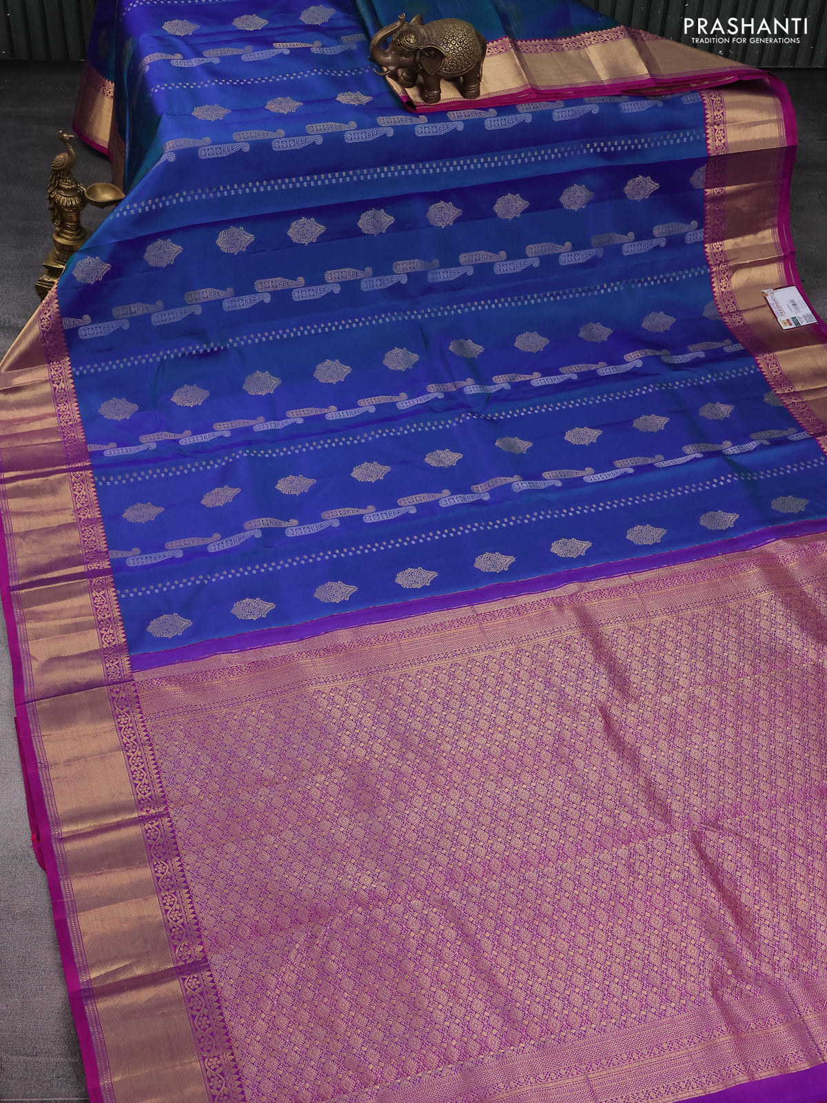 Pure kanchipuram silk saree dual shade of bluish green and purple with silver & gold zari woven buttas and rich zari woven border