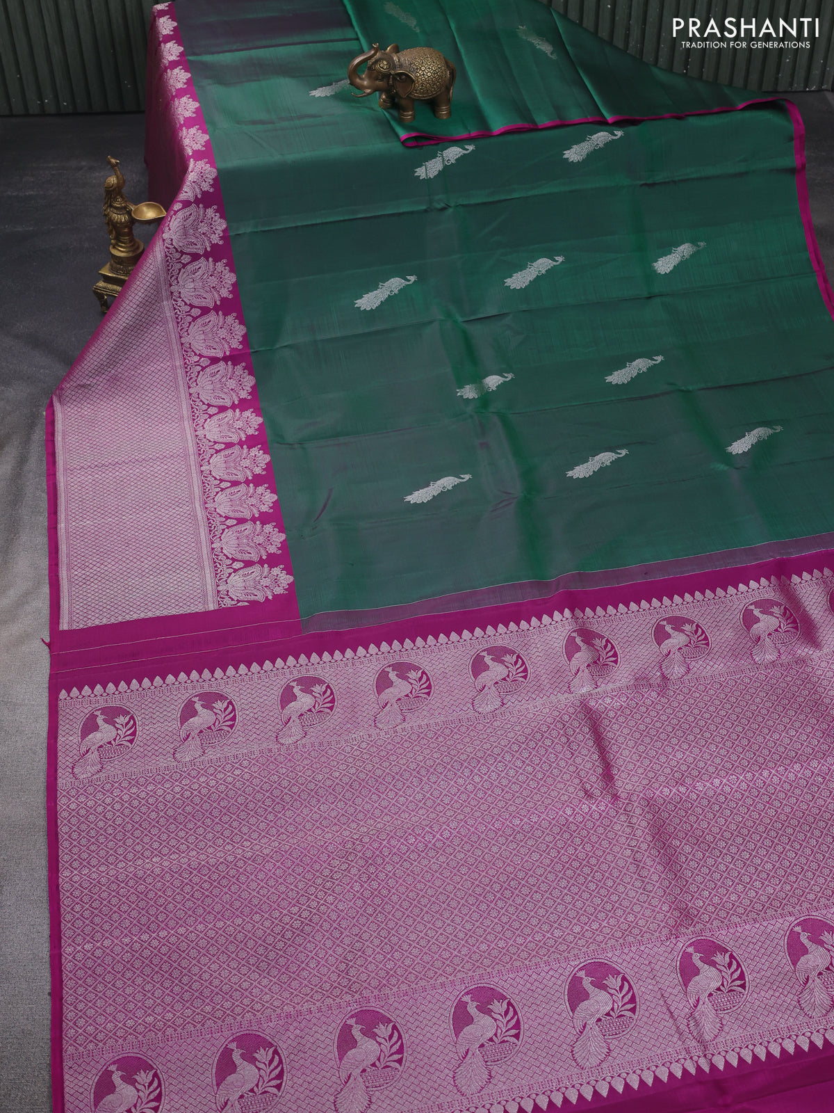 Pure kanchipuram silk saree dual shade of green and purple with silver zari woven peacock buttas and silver zari woven border