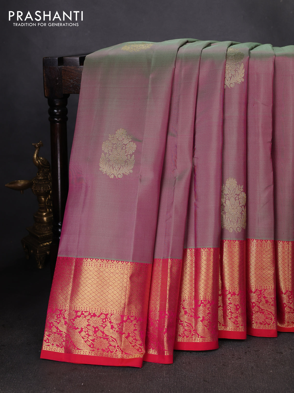 Pure kanchipuram silk saree dual shade of greenish pink and dual shade of pinkish orange with zari woven buttas and zari woven border