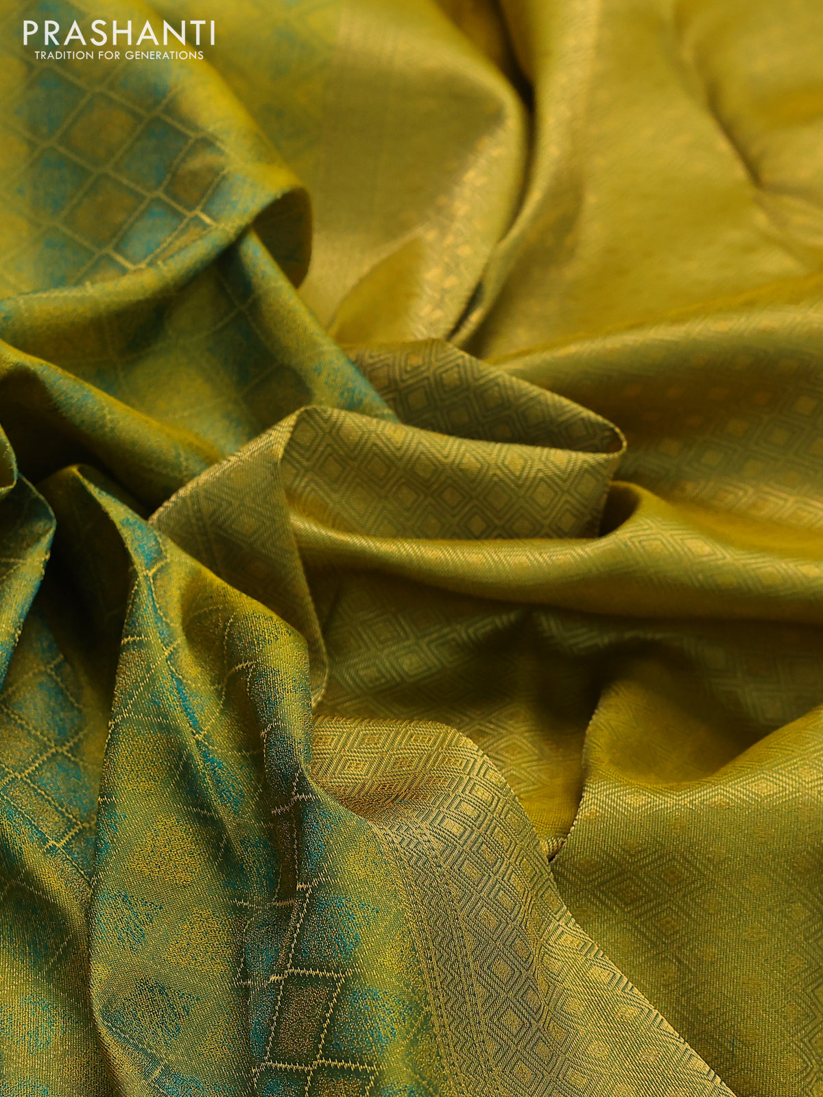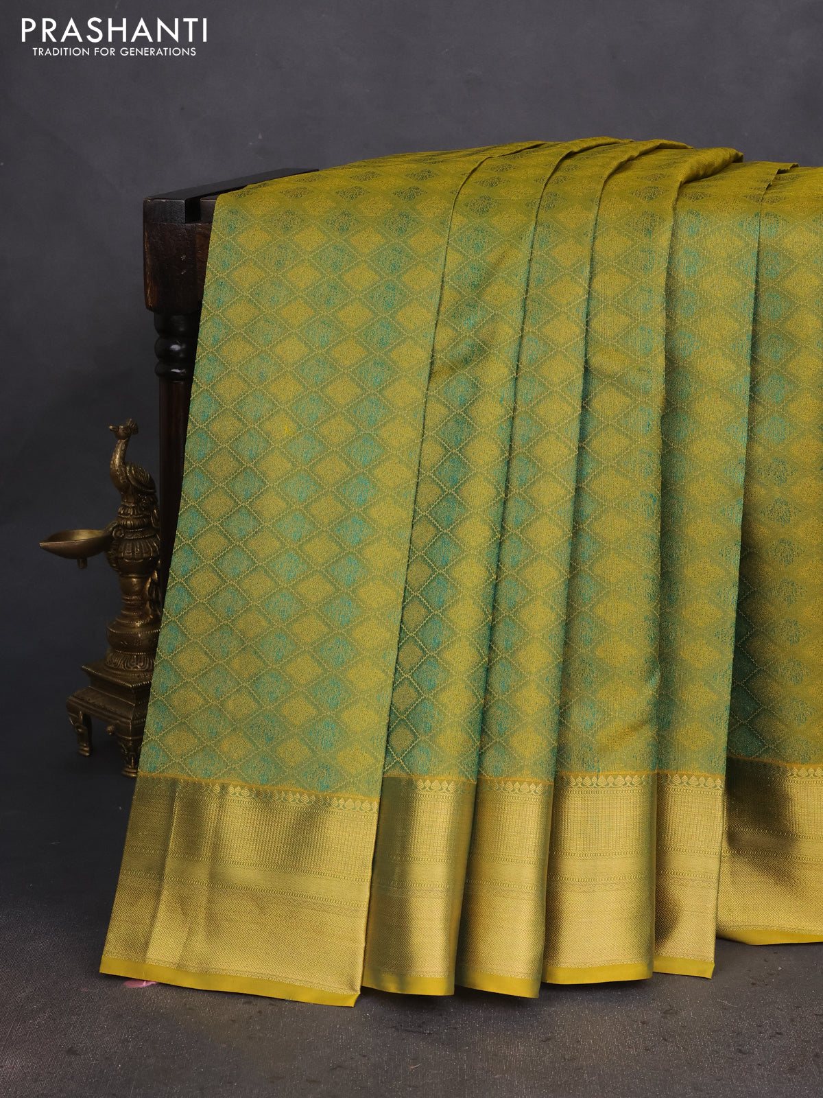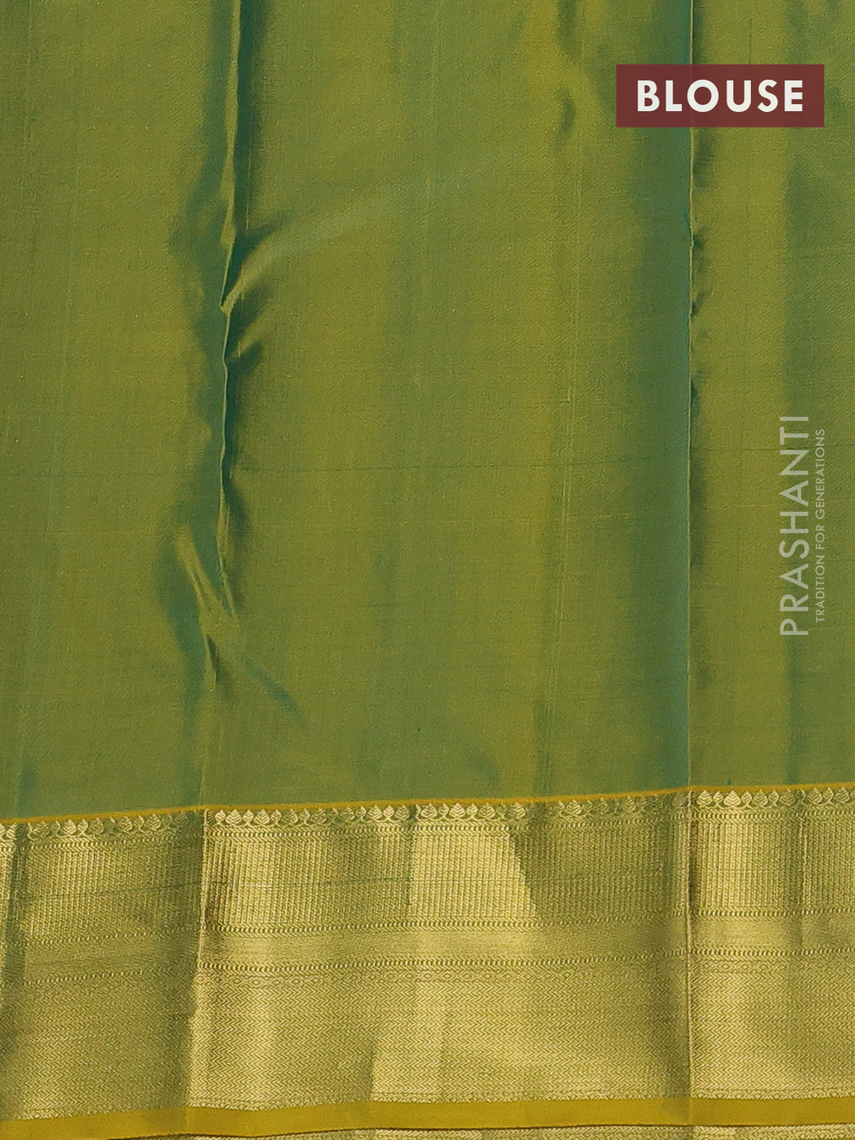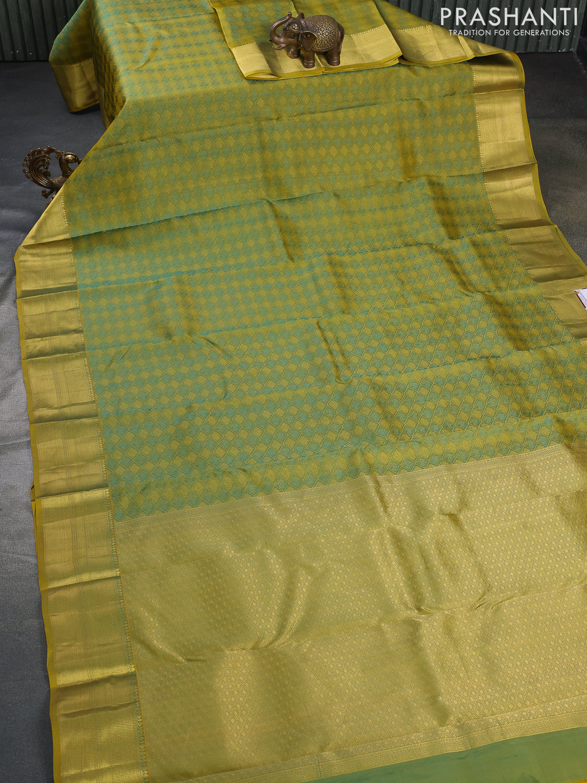 Pure kanchipuram silk saree dual shade of mehendi green and mustard shade with allover self emboss & zari weaves and rich zari woven border
