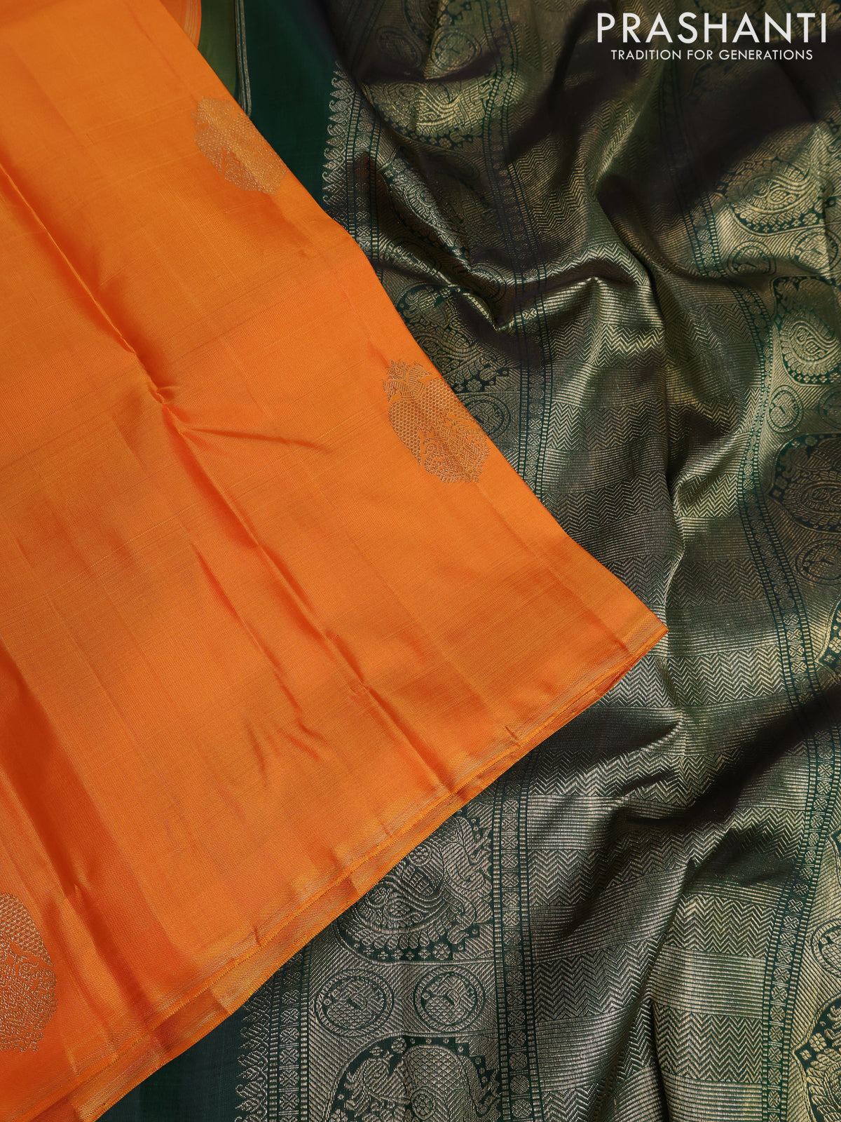 Pure kanchipuram silk saree dual shade of orange and green with zari woven buttas and piping border