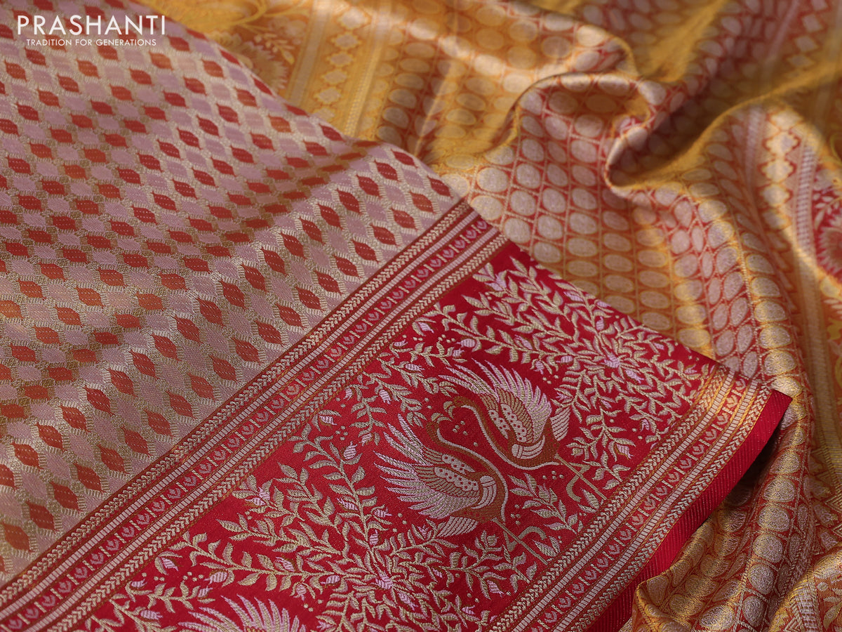 Pure Kanchipuram silk saree dual shade of pastel pink and maroon with allover zari woven brocade weaves and zari woven mina border