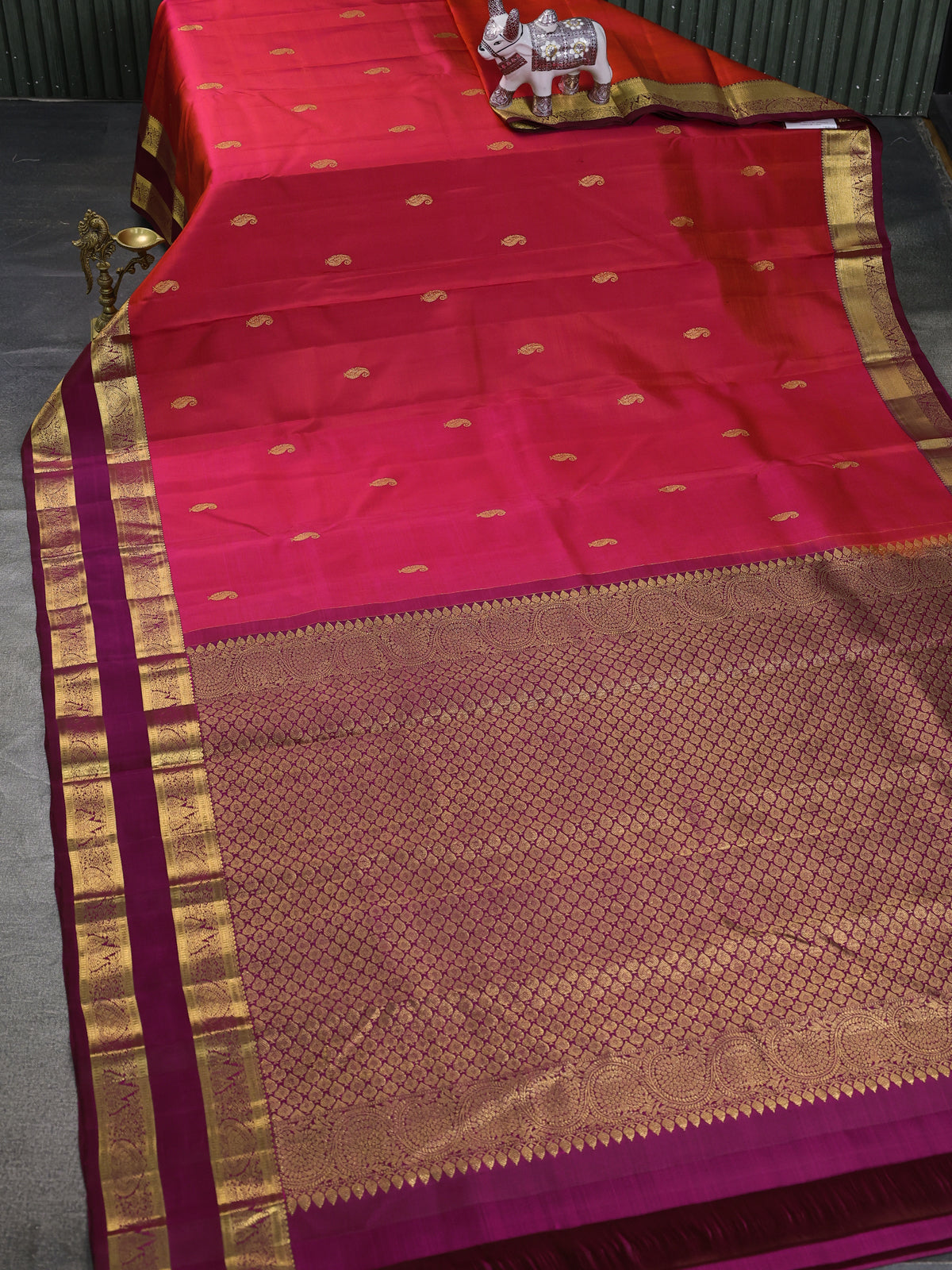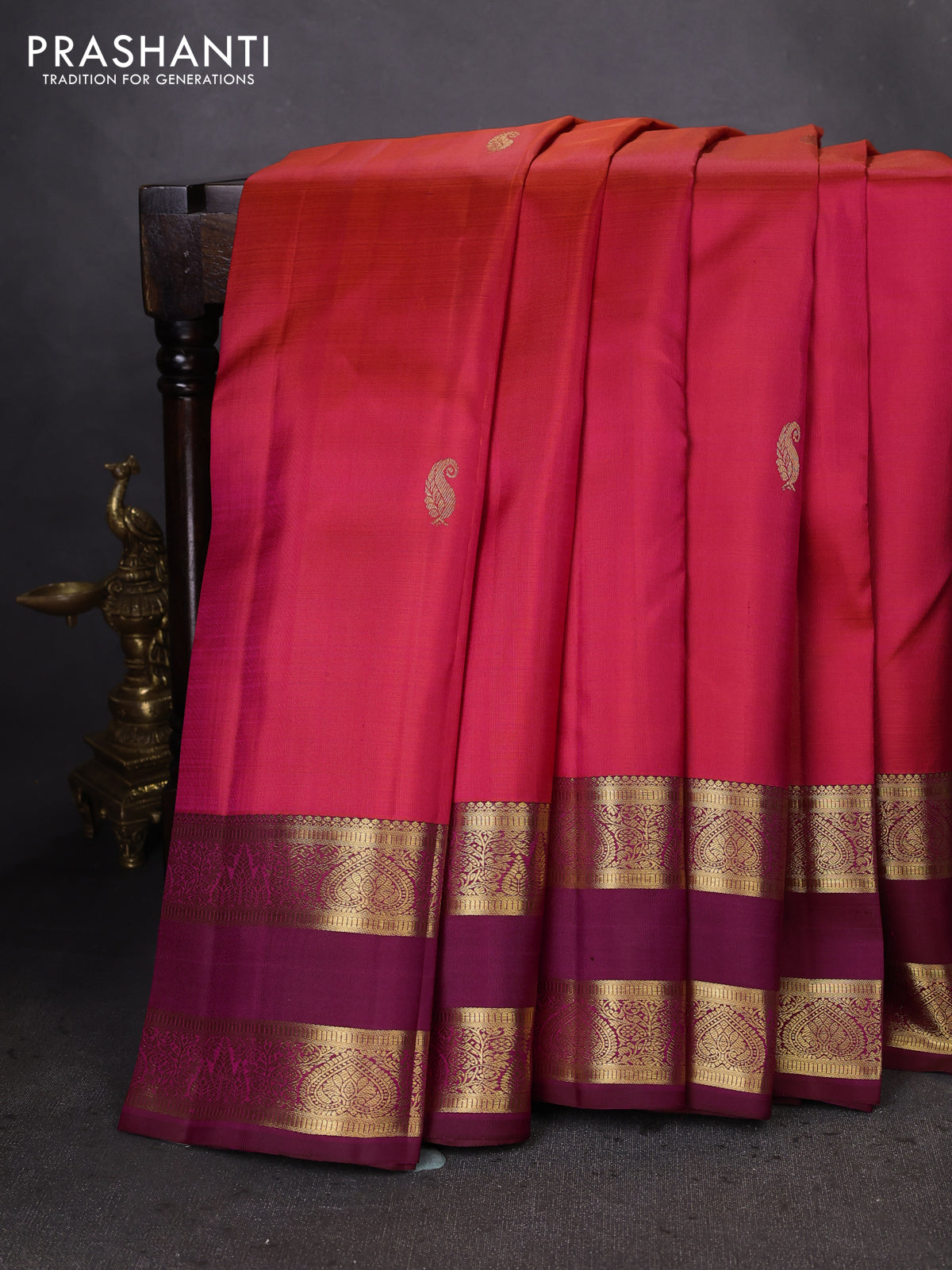 Pure kanchipuram silk saree dual shade of pinkish orange and magenta pink with zari woven buttas and rettapet zari woven border