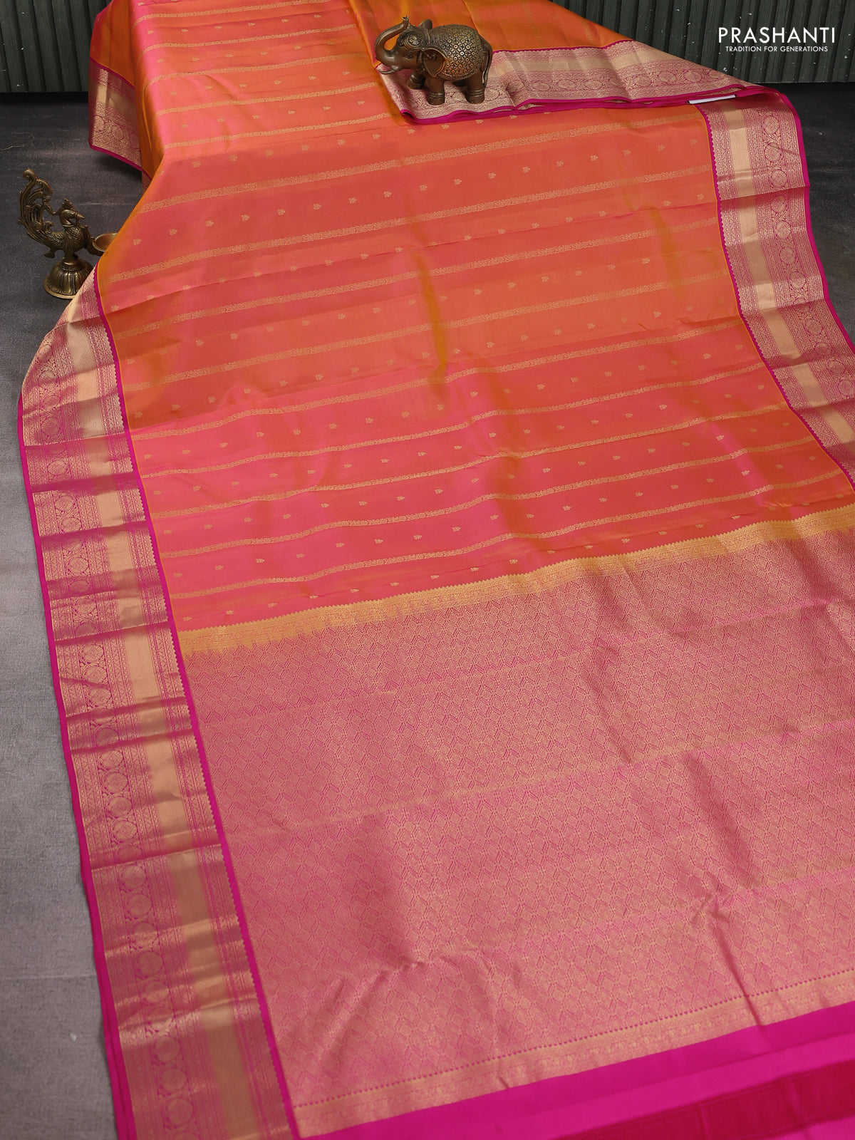 Pure kanchipuram silk saree dual shade of pinkish orange and pink with allover zari weaves & buttas and rich zari woven border