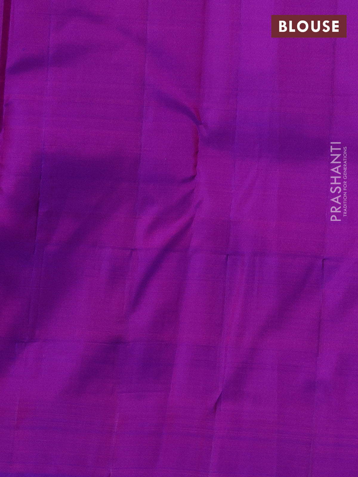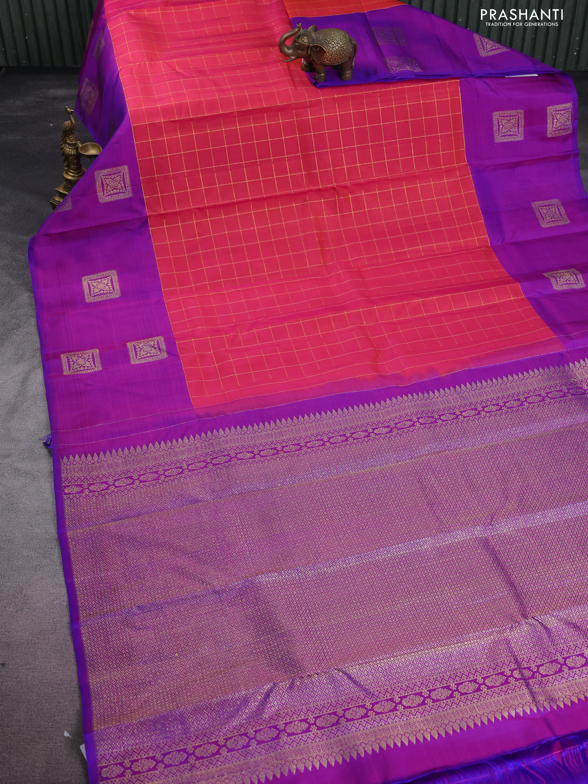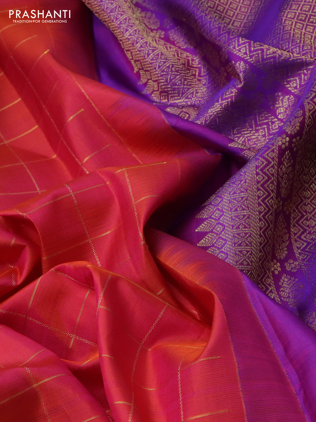 Pure kanchipuram silk saree dual shade of pinkish orange and purple with zari woven buttas and zari woven box type butta border