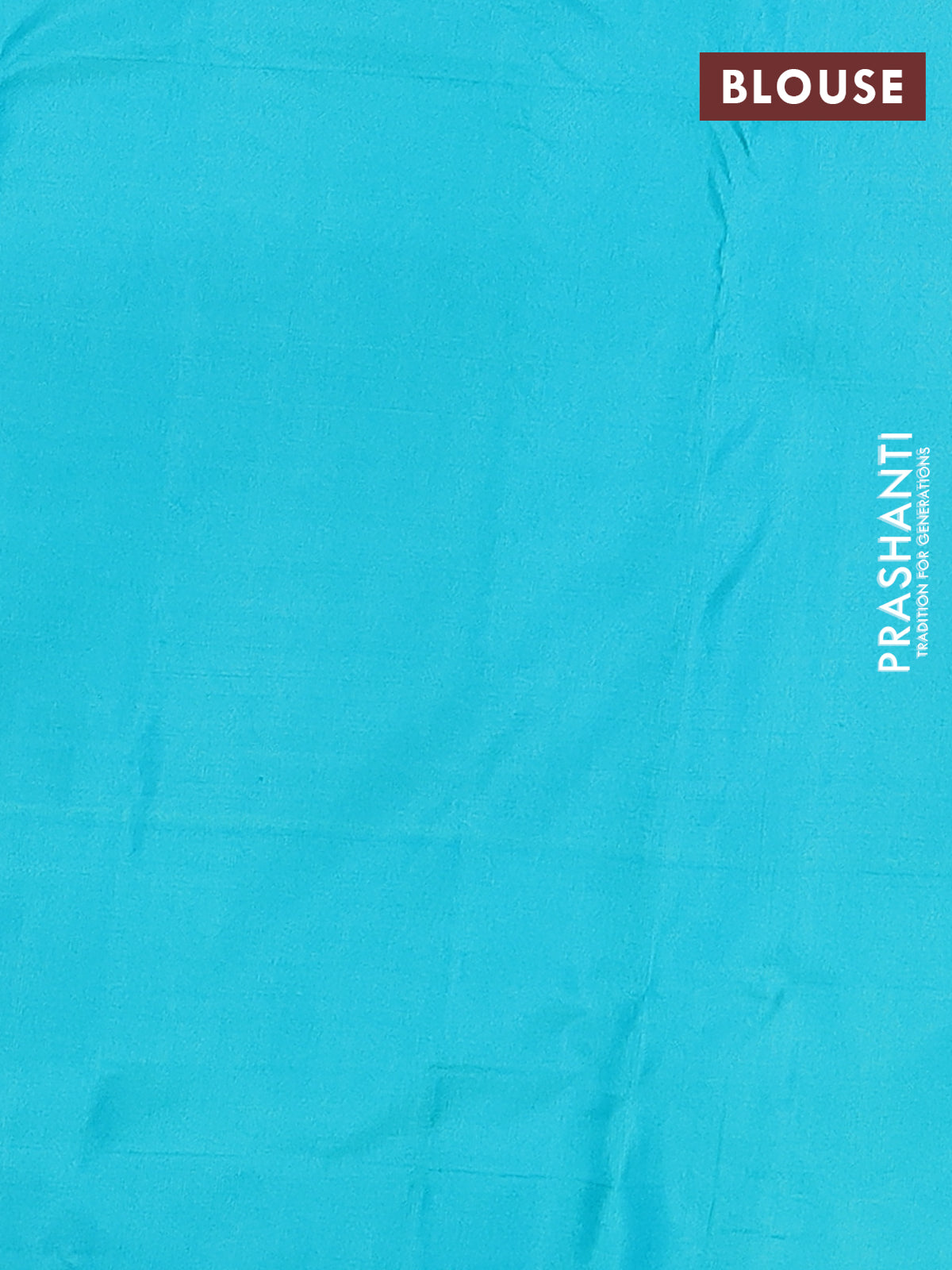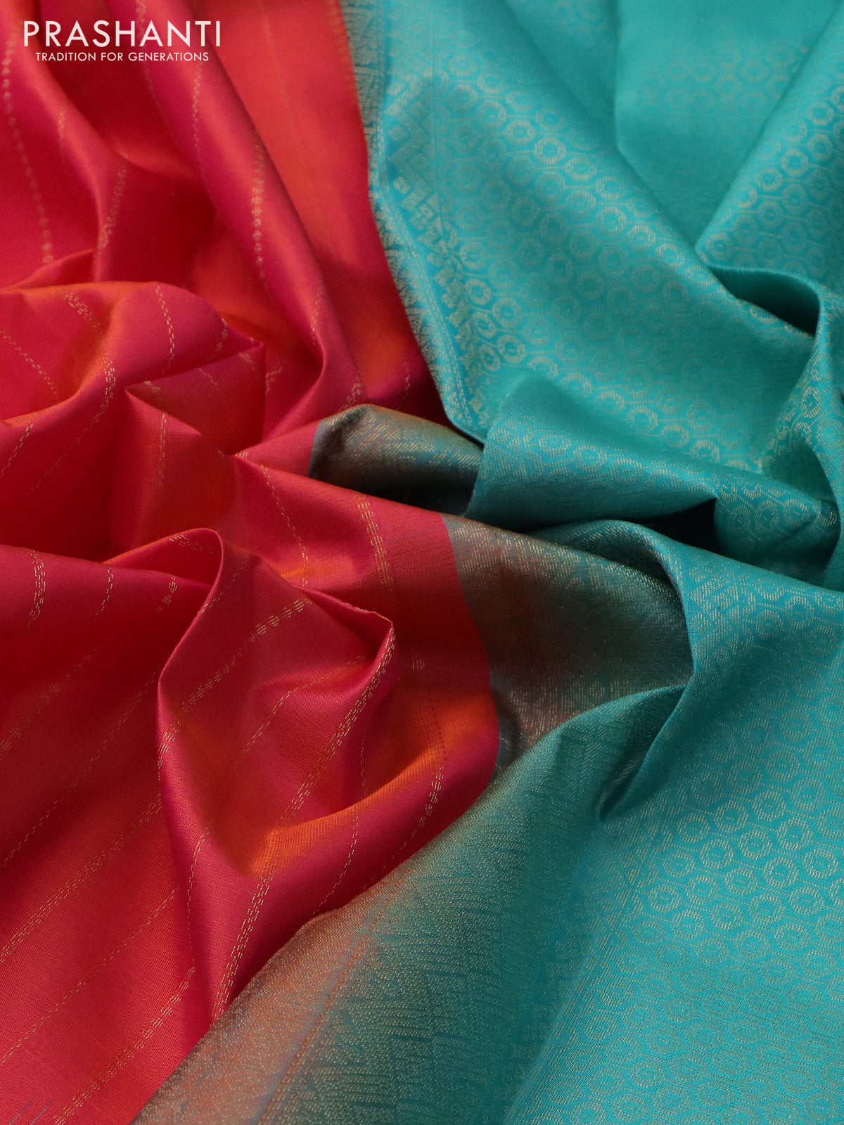 Pure kanchipuram silk saree dual shade of pinkish orange and teal blue with allover zari weaves and simple border