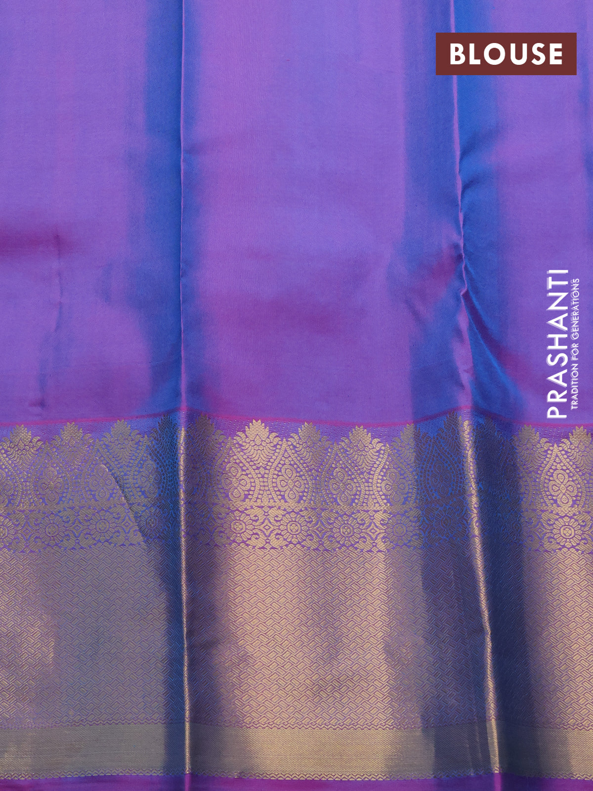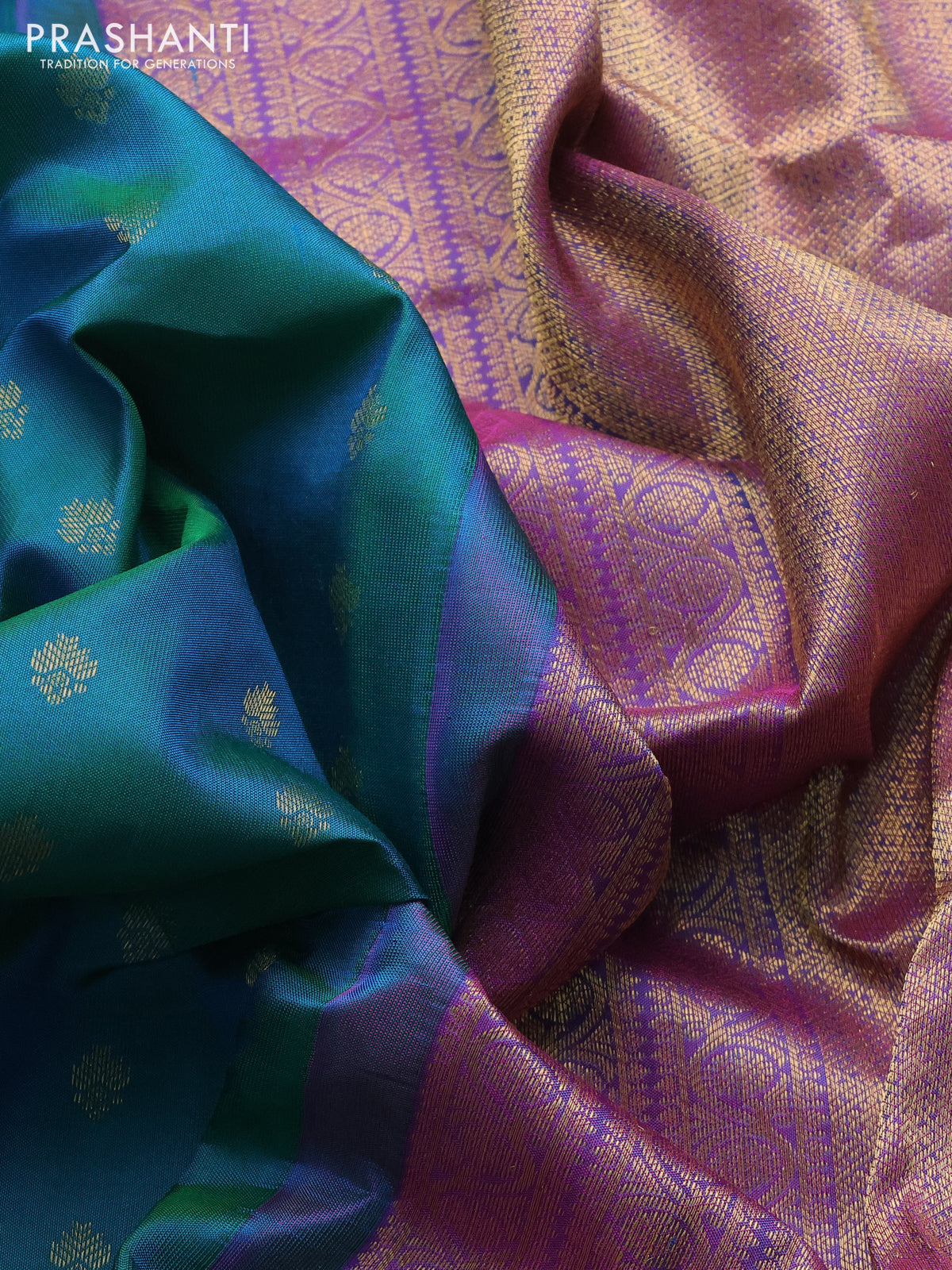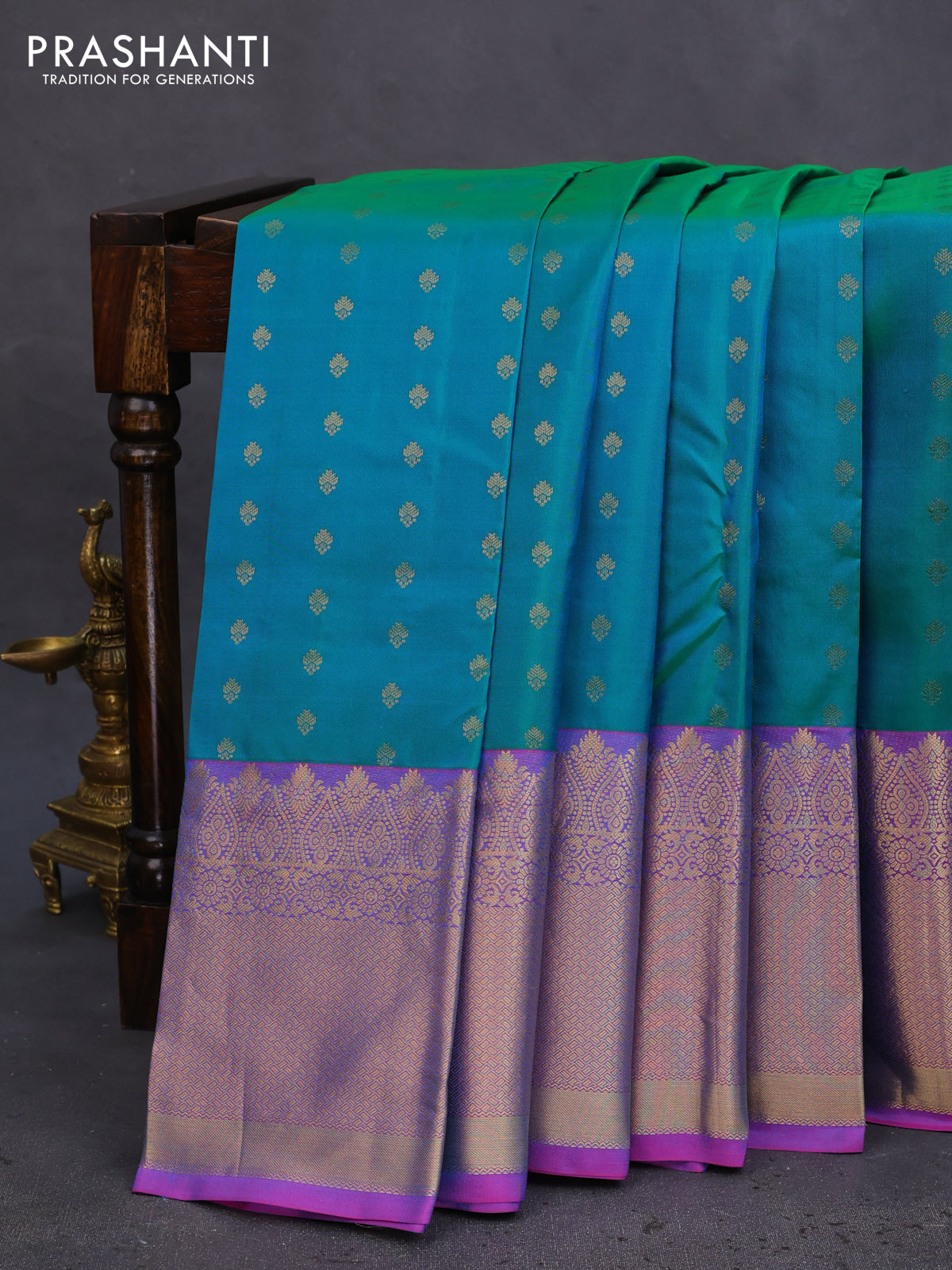 Pure kanchipuram silk saree dual shade of teal green and purple with zari woven buttas and zari woven border