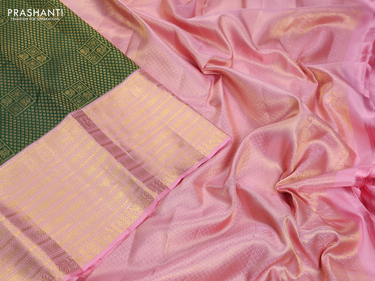 Pure kanchipuram silk saree green and peach pink with allover zari woven brocade weaves and zari woven border
