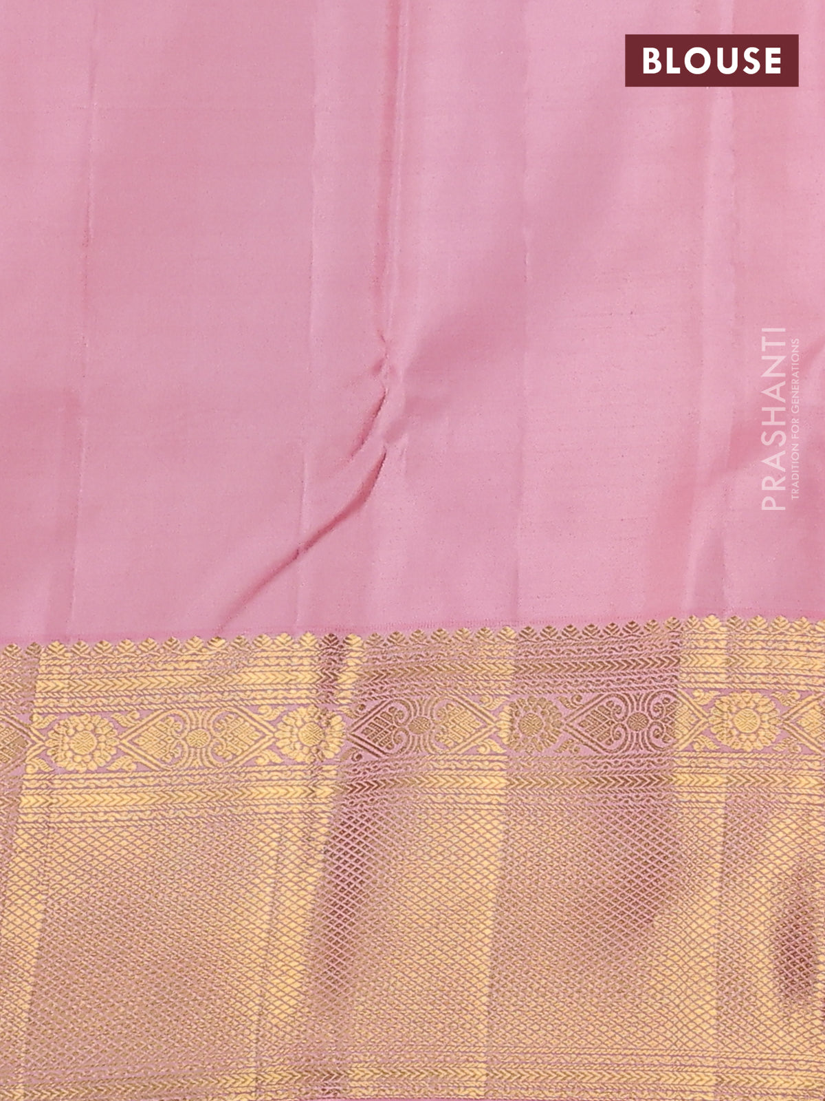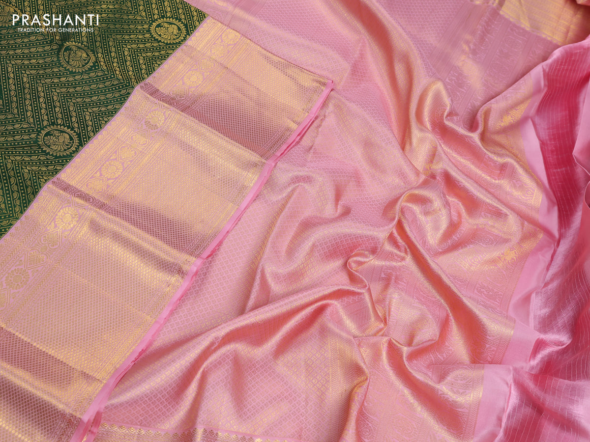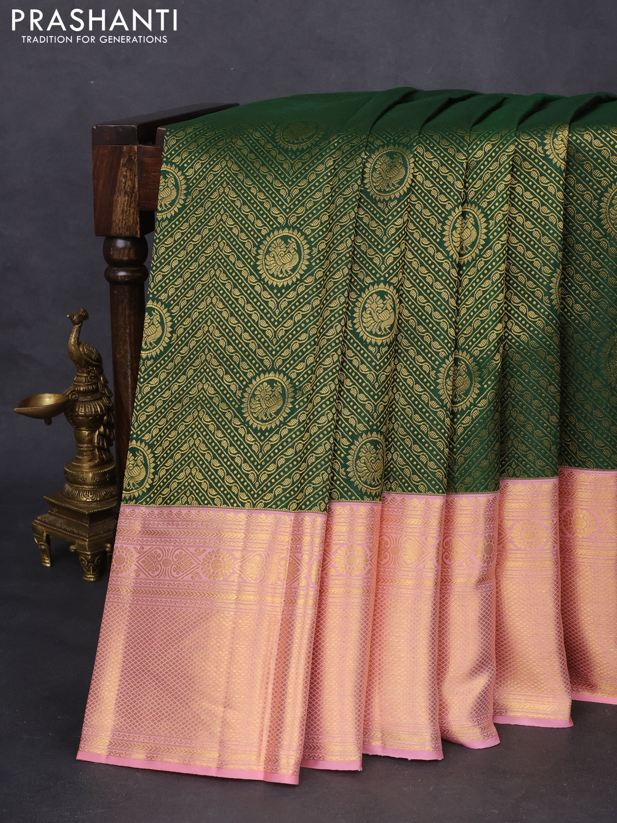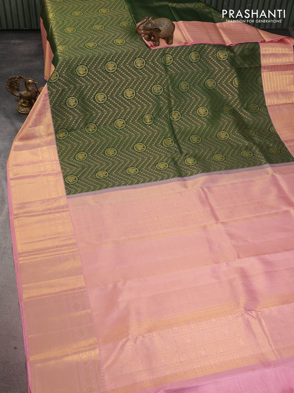 Pure kanchipuram silk saree green and peach shade with allover zari woven brocade weaves and long zari woven border