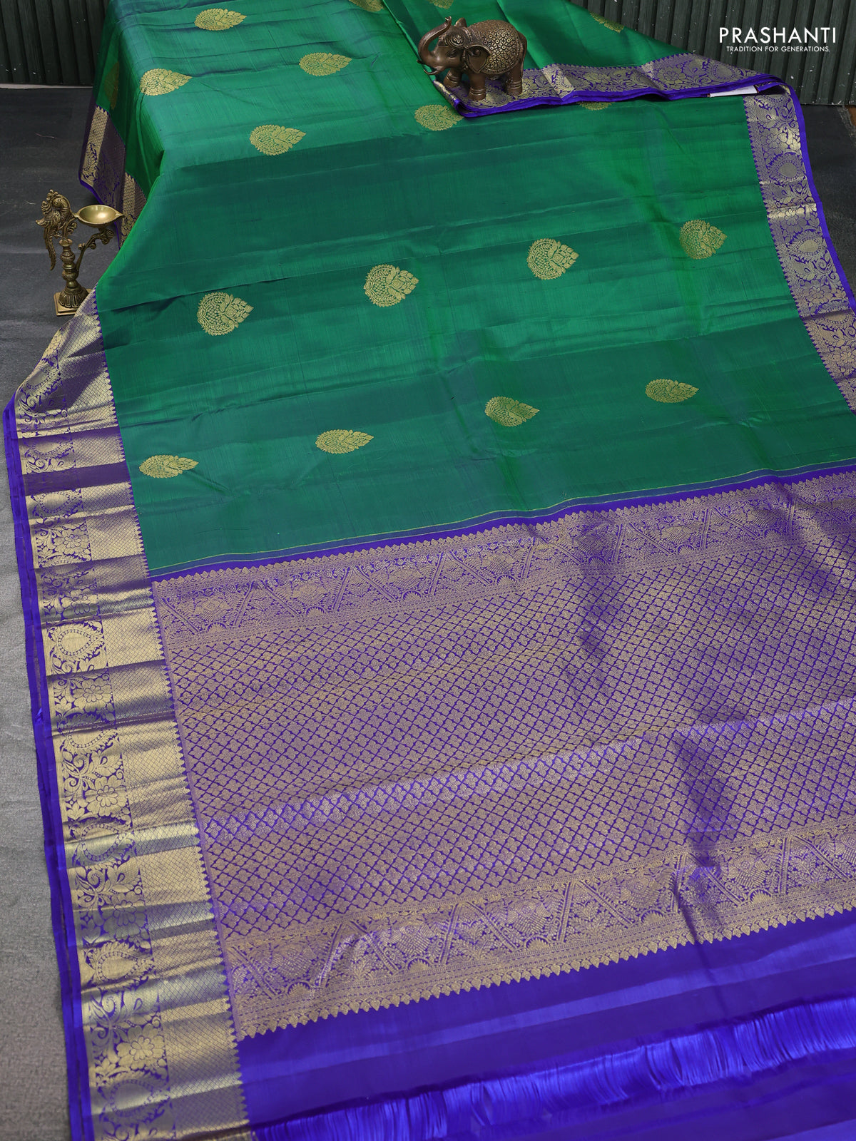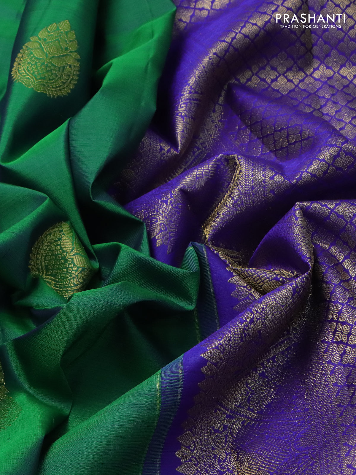 Pure kanchipuram silk saree green and royal blue with zari woven buttas and zari woven border