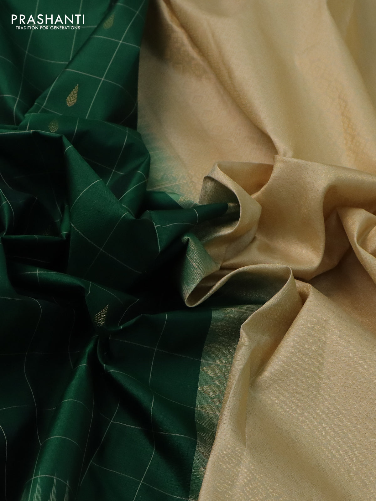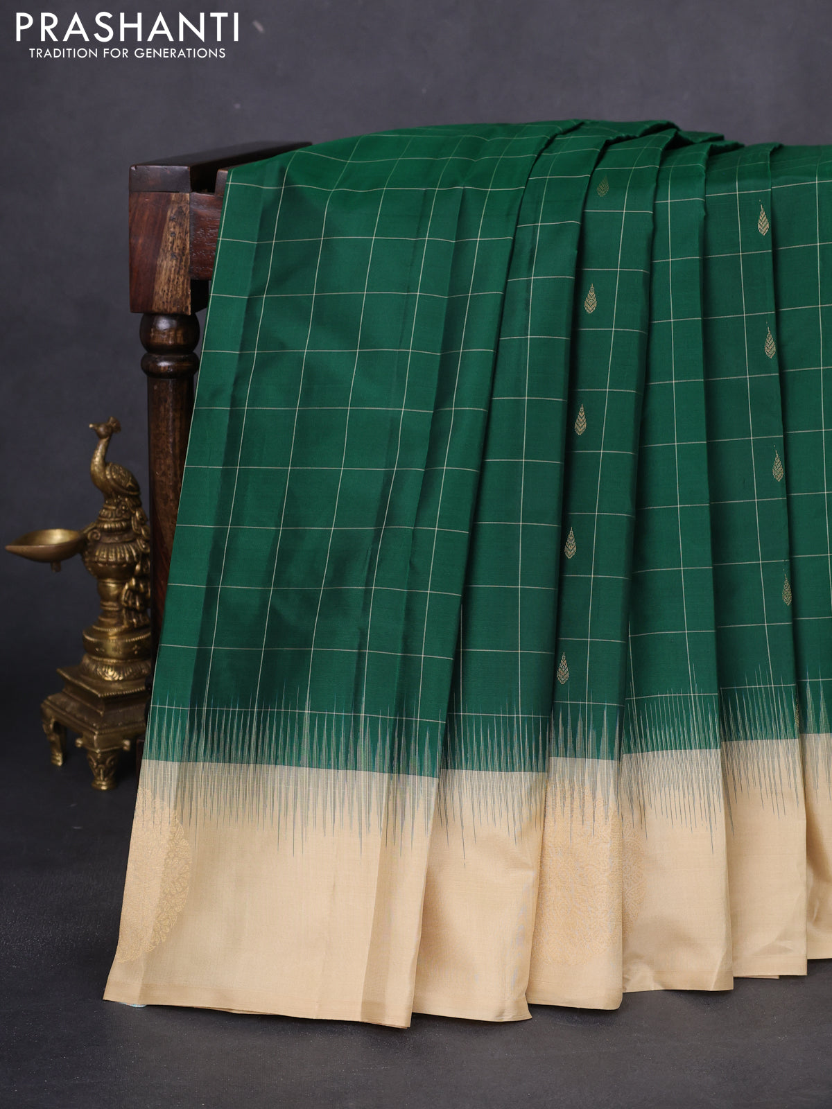 Pure kanchipuram silk saree green and sandal with allover checks & zari buttas and zari woven butta border