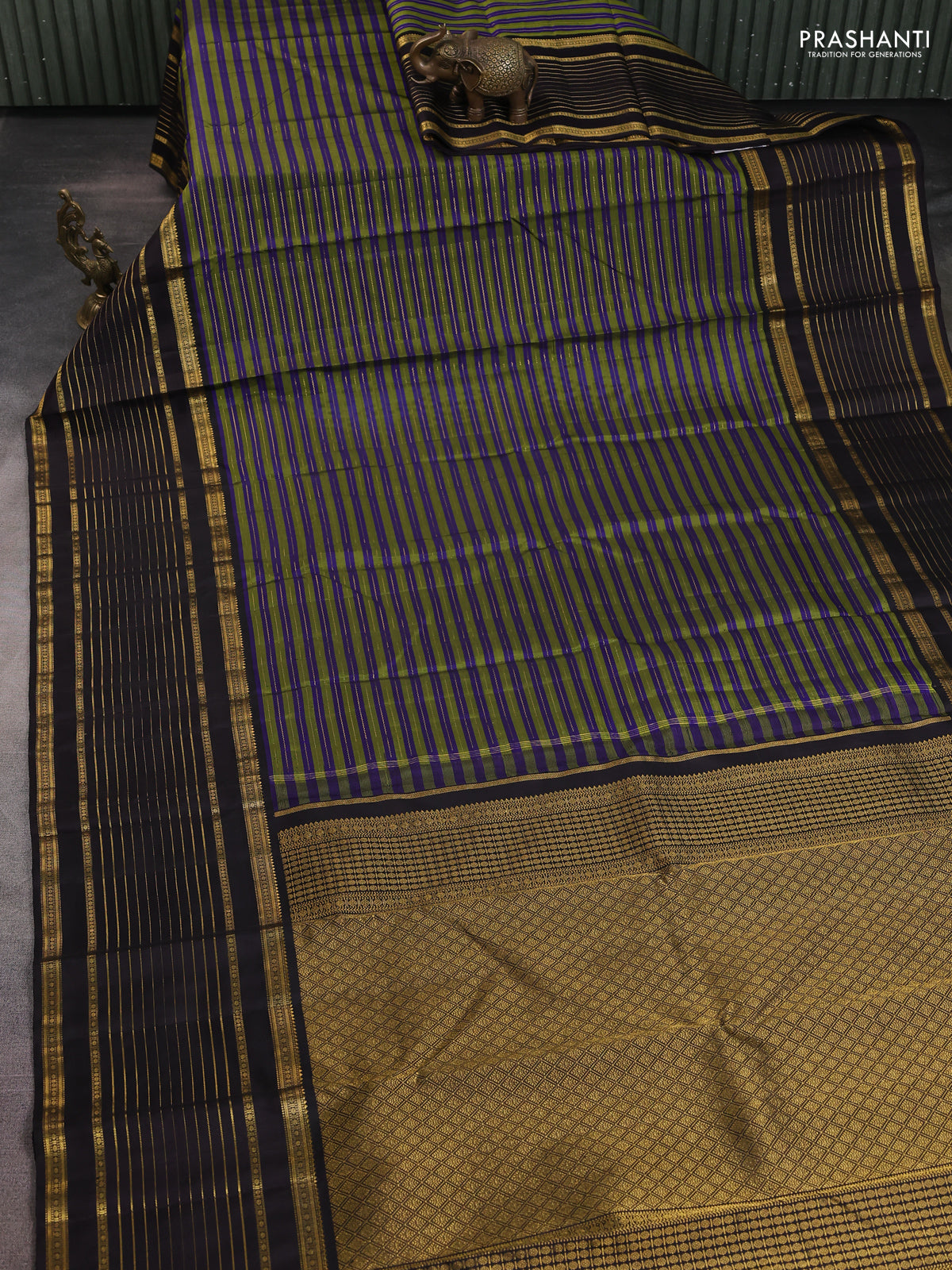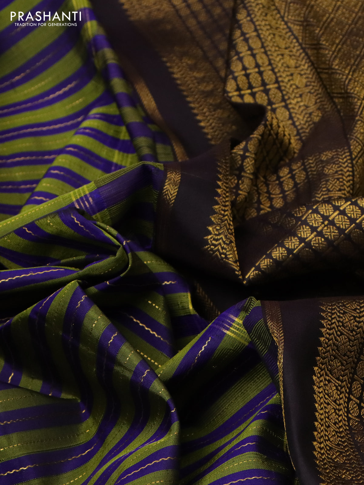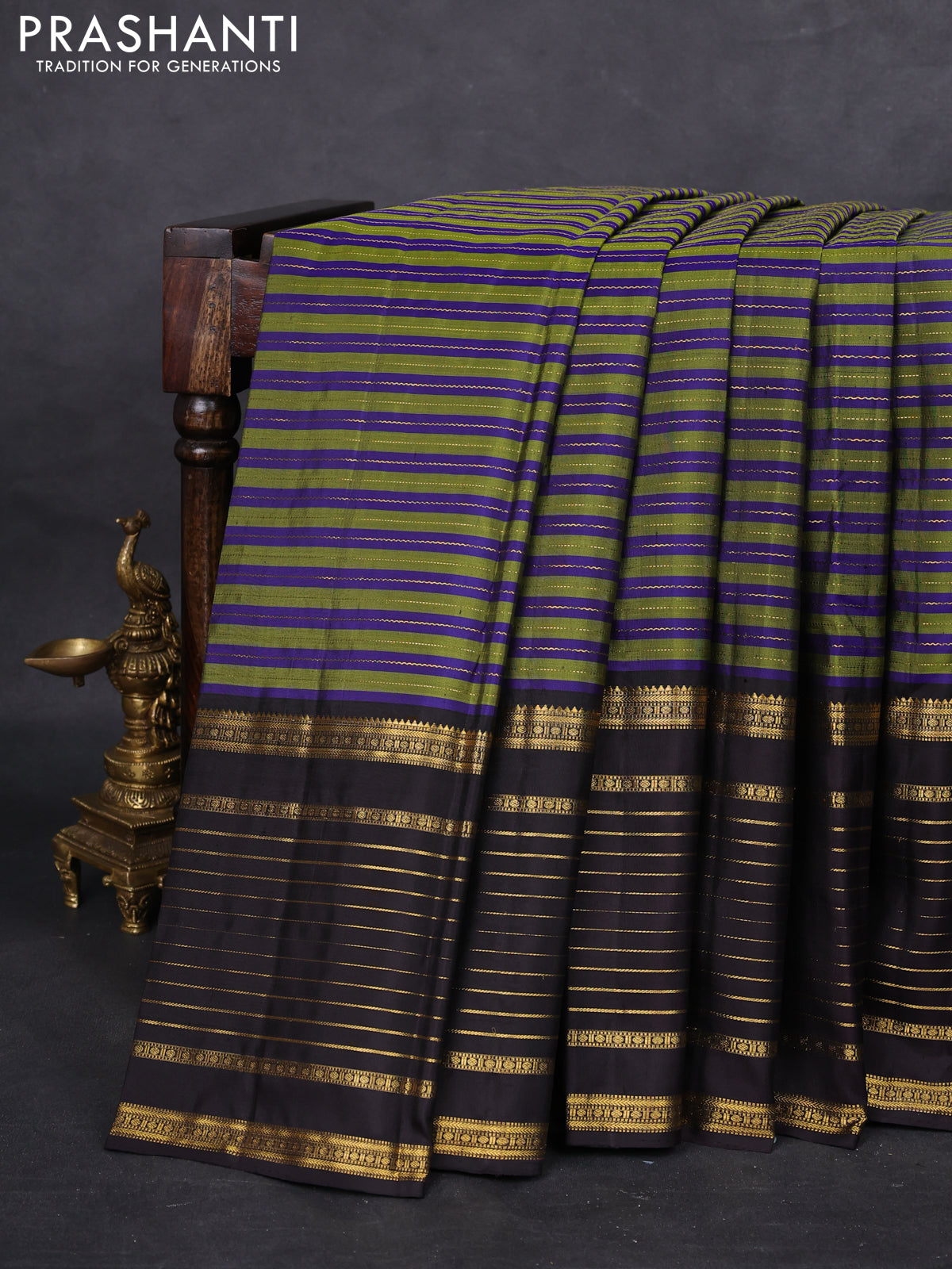 Pure kanchipuram silk saree green blue and coffee brown with allover zari weaves and long zari wovenborder