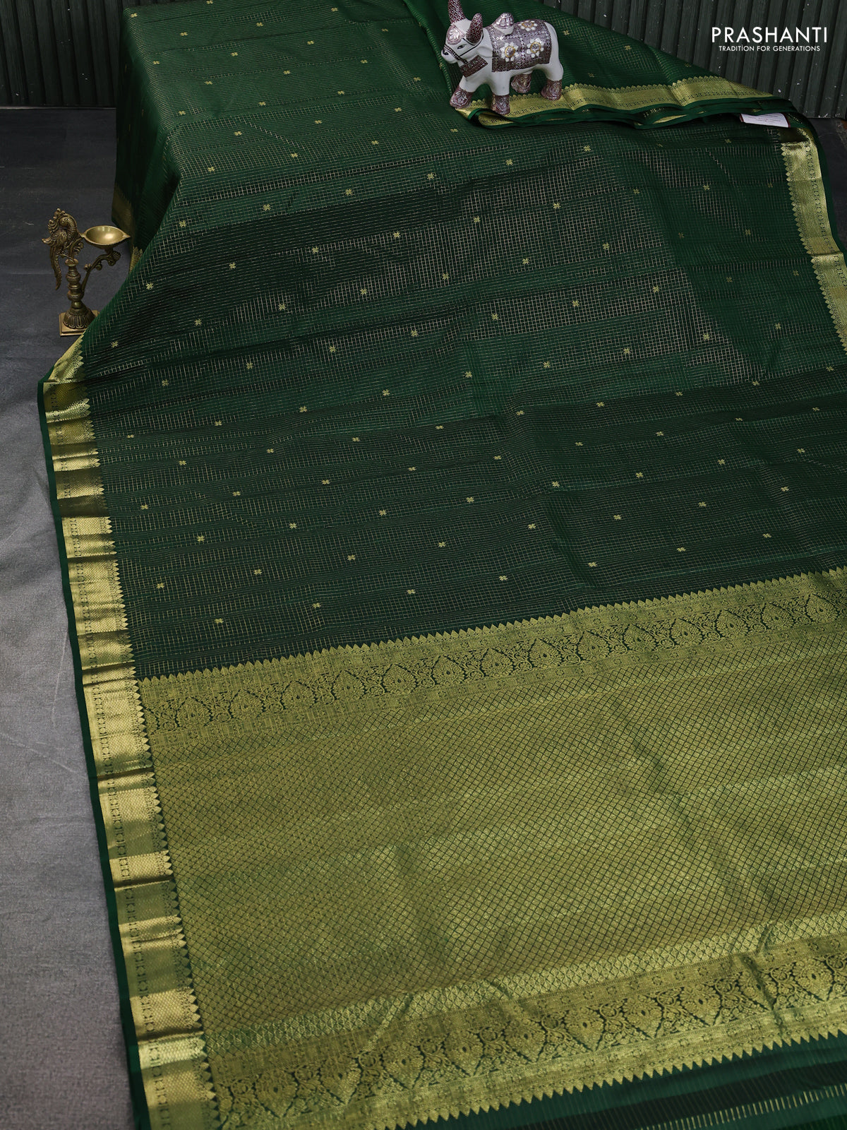 Pure kanchipuram silk saree green with allover zari checked pattern and zari woven border
