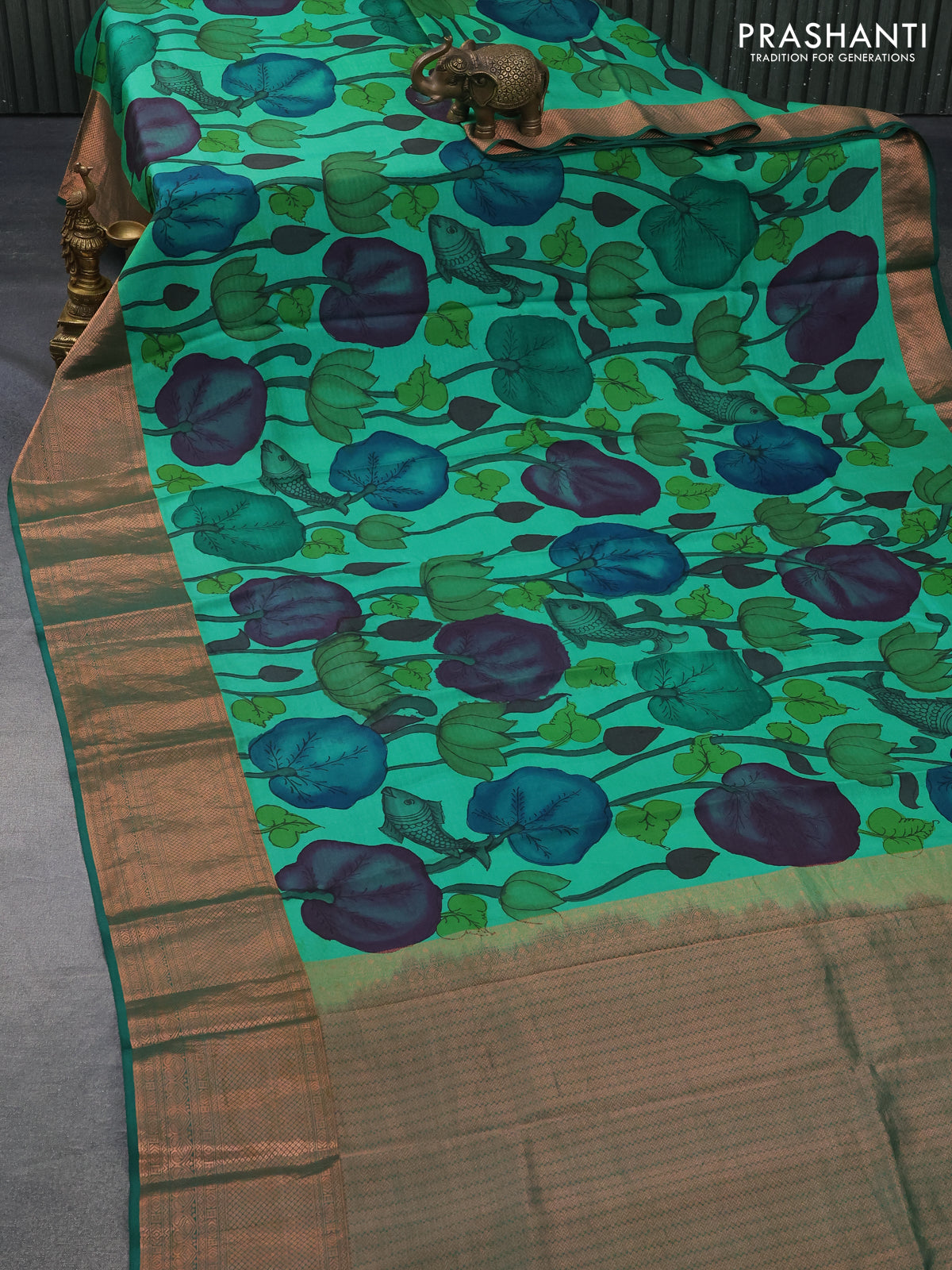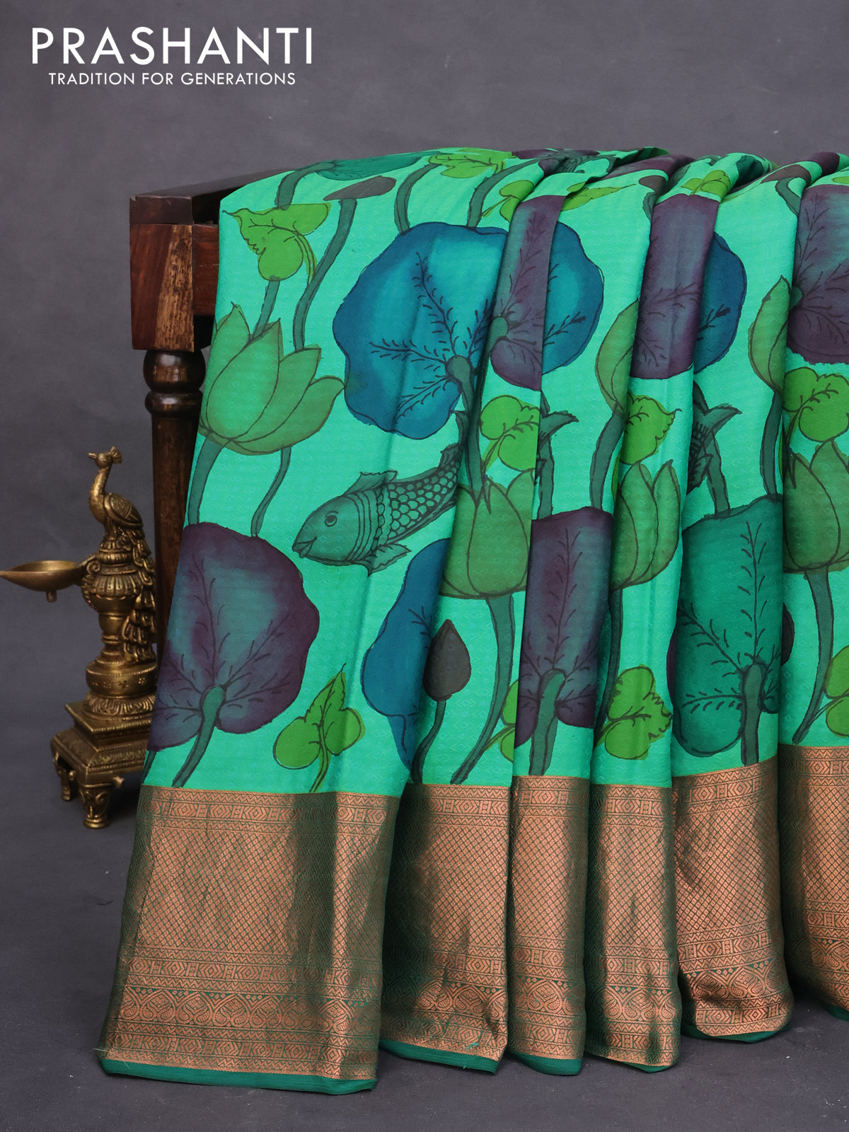 Pure kanchipuram silk saree green with pen kalamkari prints & self emboss and copper zari woven border