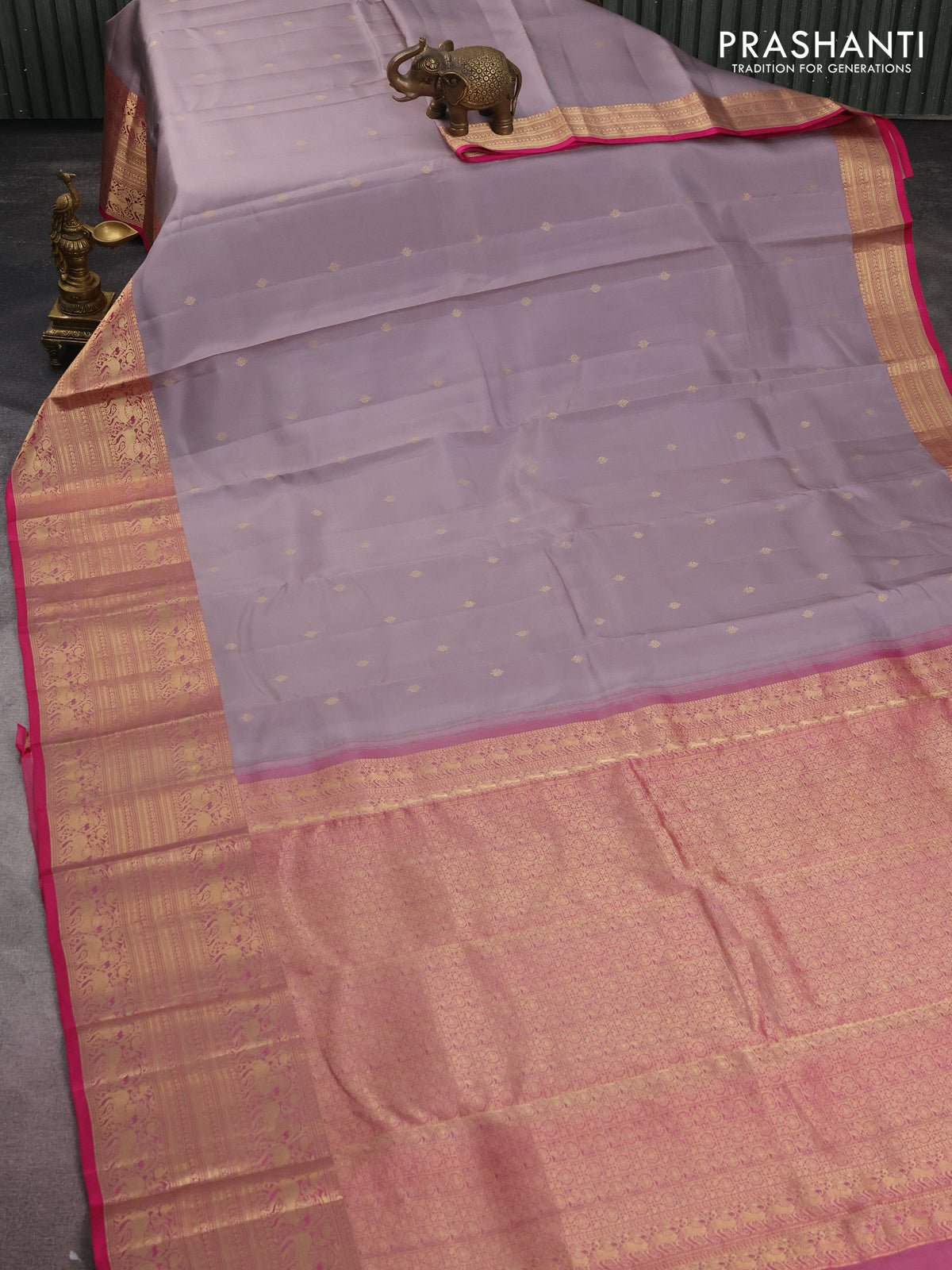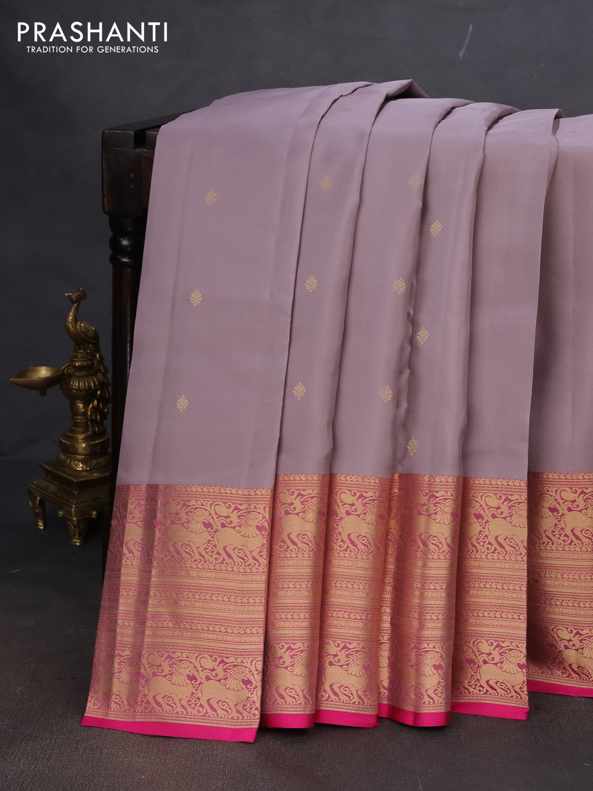 Pure kanchipuram silk saree grey and pink with zari woven buttas and long zari woven buttas