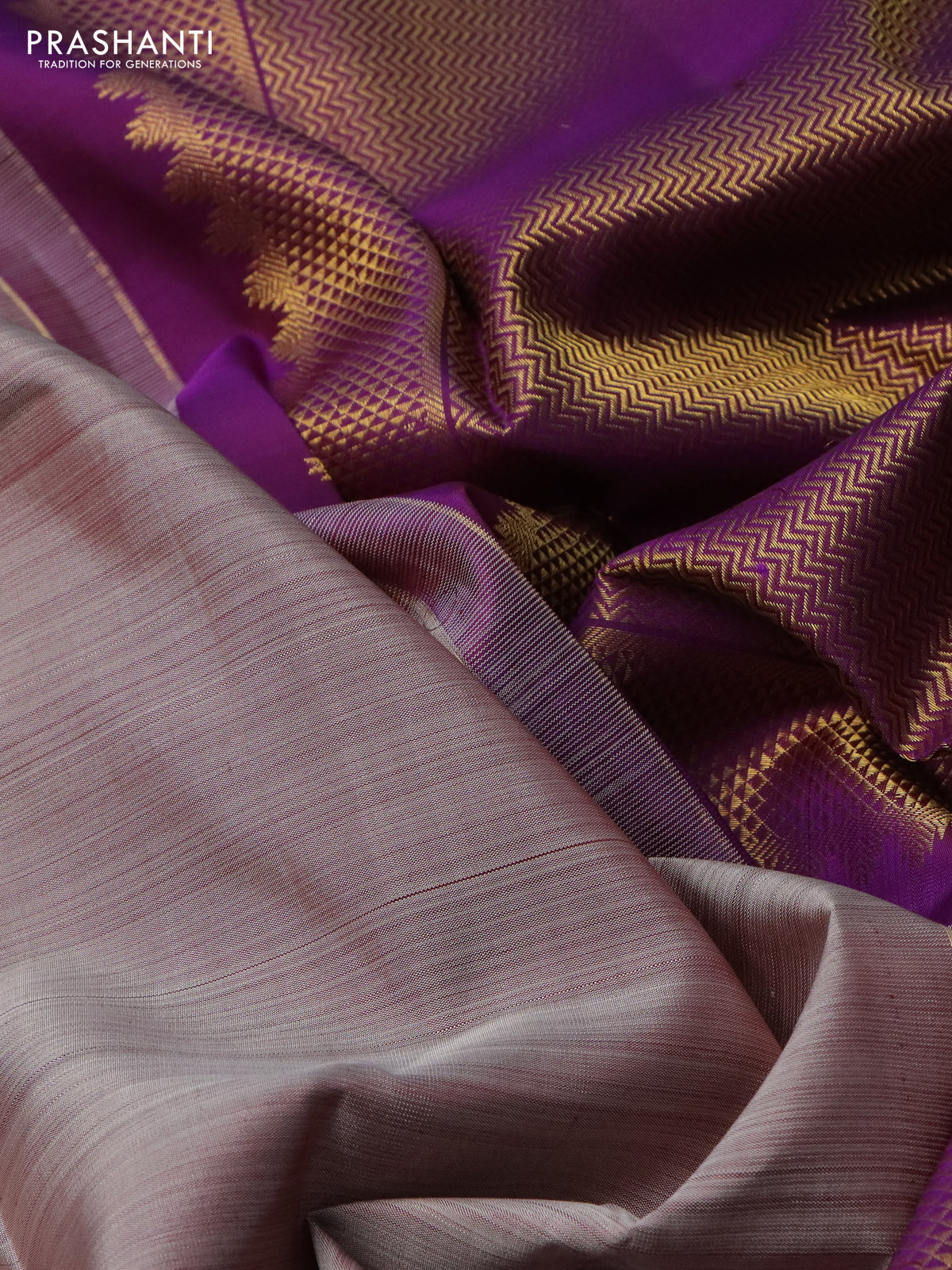 Pure kanchipuram silk saree grey and purple with plain body and zari checked butta border