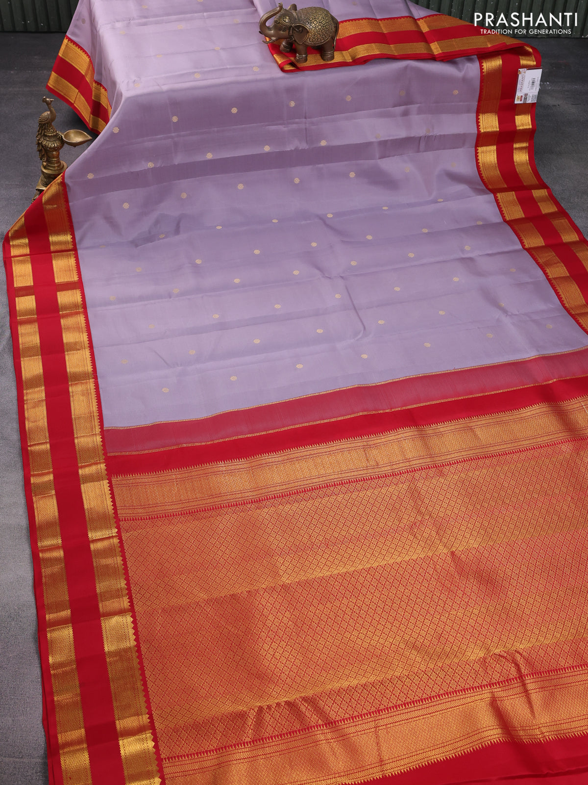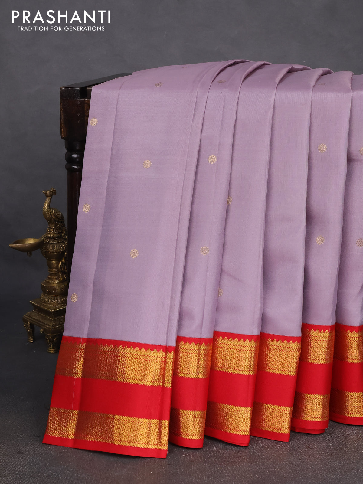 Pure kanchipuram silk saree lavender and red with zari woven buttas and rettapet zari woven korvai border