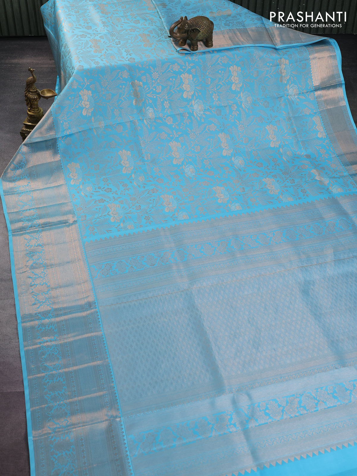 Pure kanchipuram silk saree light blue with allover zari woven floral brocade weaves and rich zari woven border