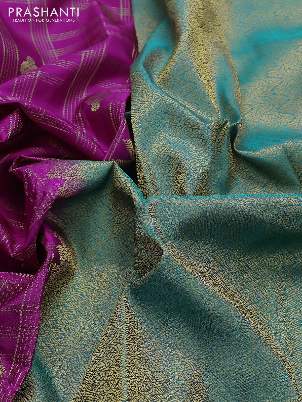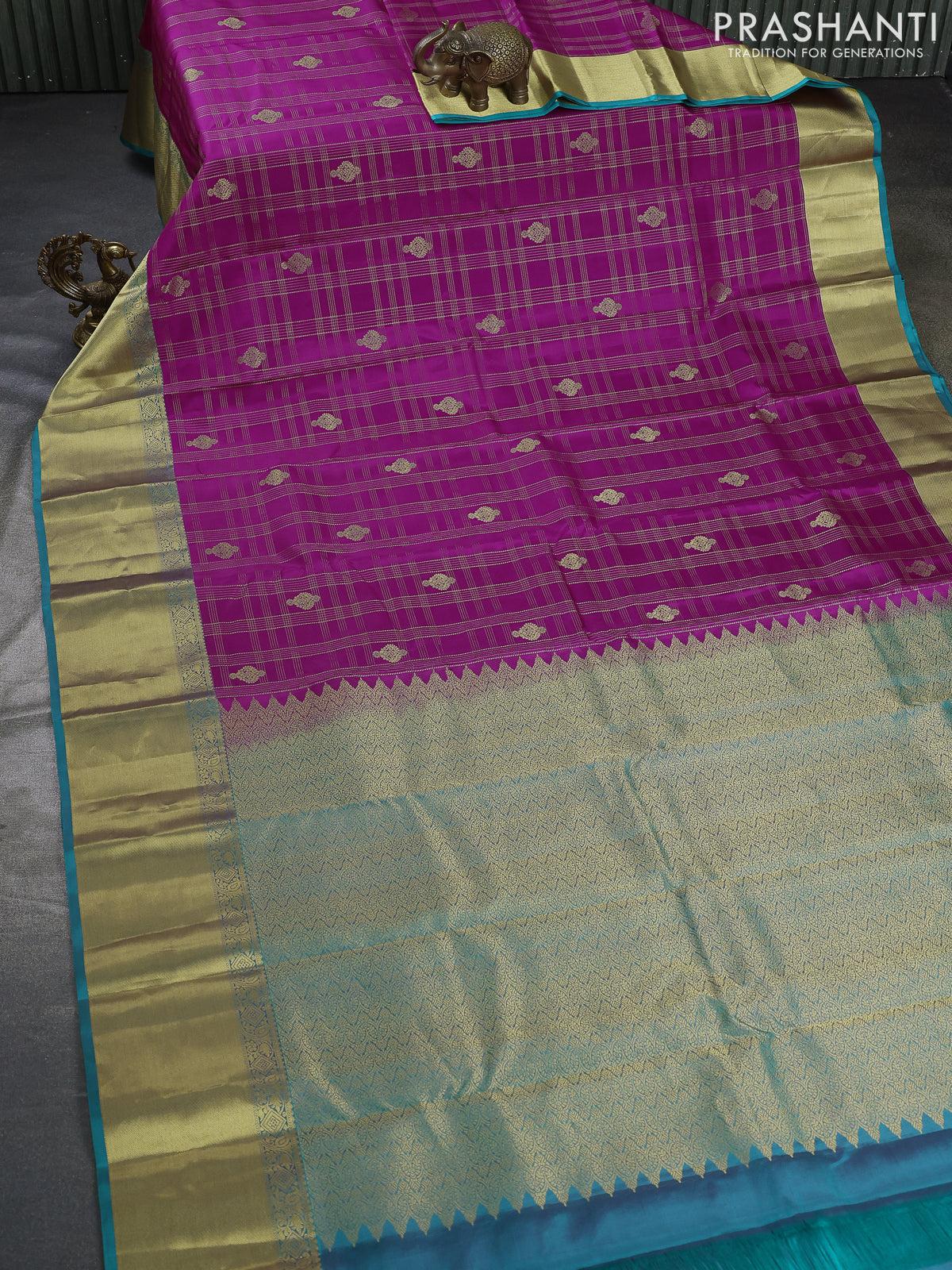 Pure kanchipuram silk saree magenta pink and teal blue with allover zari checks & buttas and rich zari woven border
