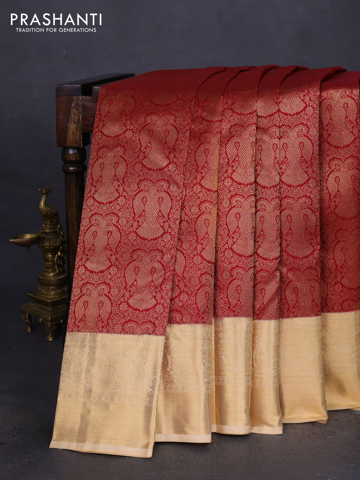 Pure kanchipuram silk saree maroon and sandal with allover zari woven brocade weaves and zari woven border