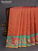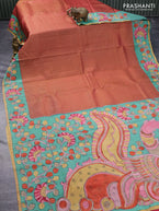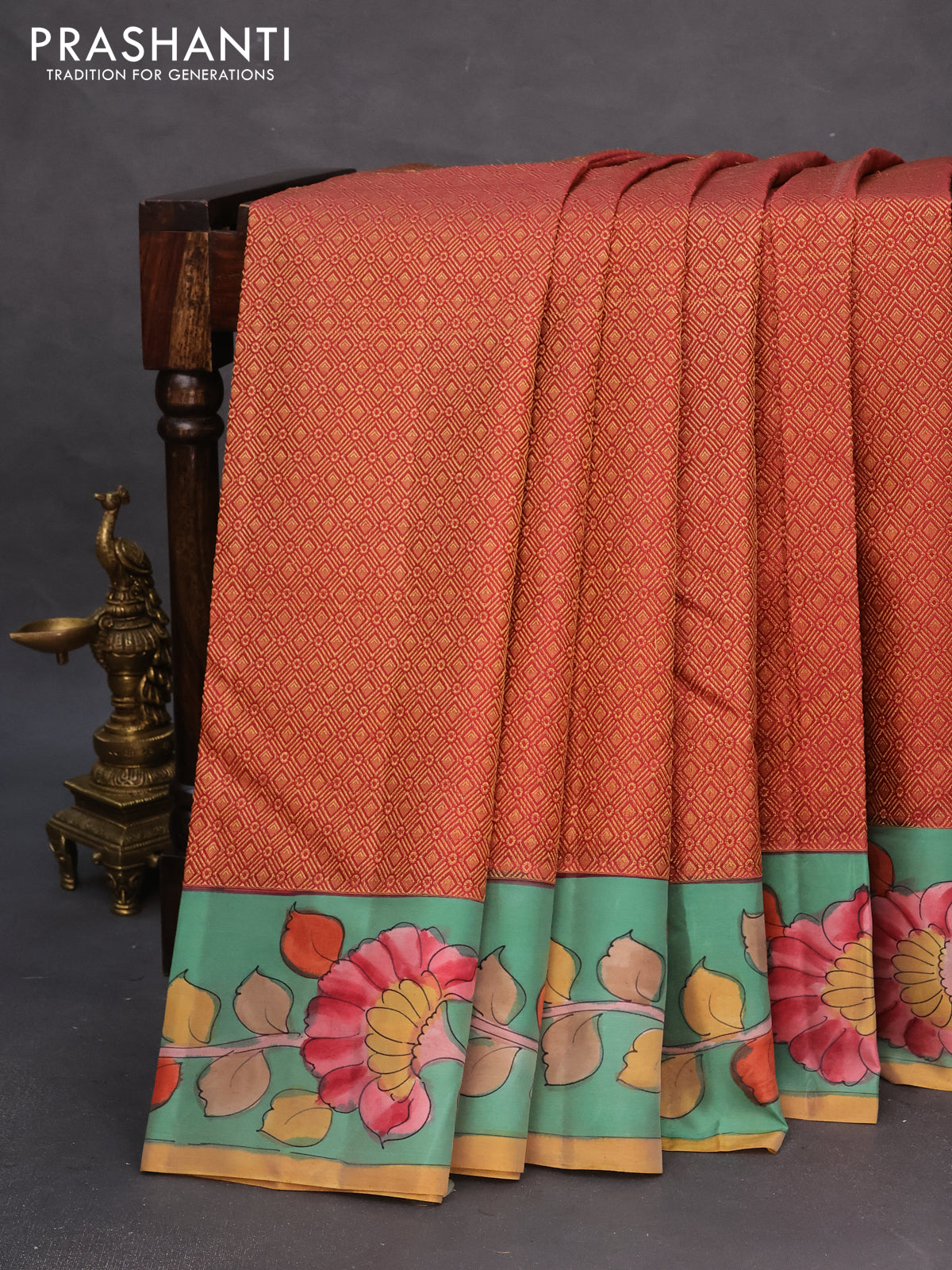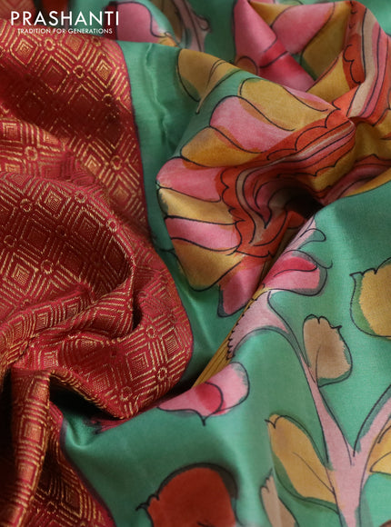 Pure kanchipuram silk saree maroon and teal green shade with allover zari woven geometric brocade weaves and kalamkari printed pallu & border