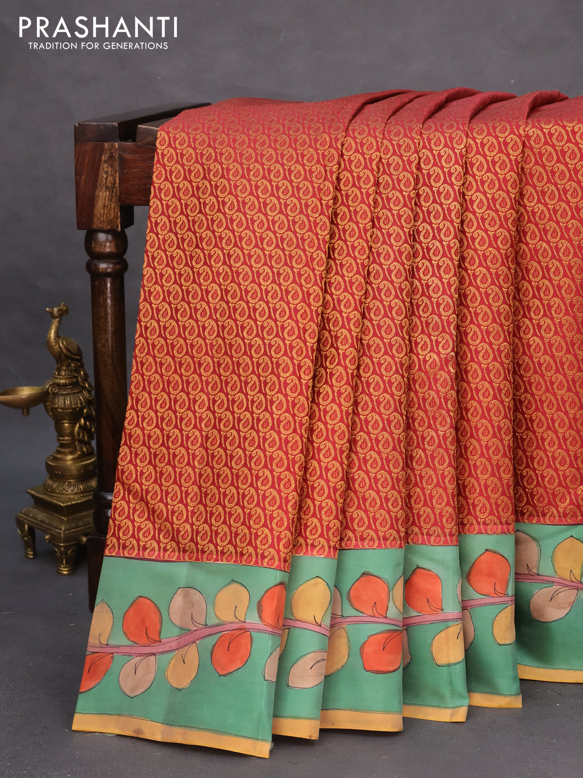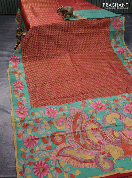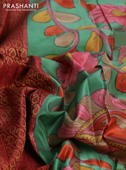 Pure kanchipuram silk saree maroon and teal green with allover zari woven paisley brocade weaves and kalamkari printed pallu & border
