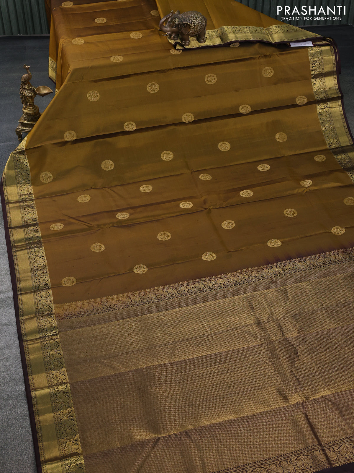Pure kanchipuram silk saree mehendi green and coffee brown with zari woven buttas and zari woven border