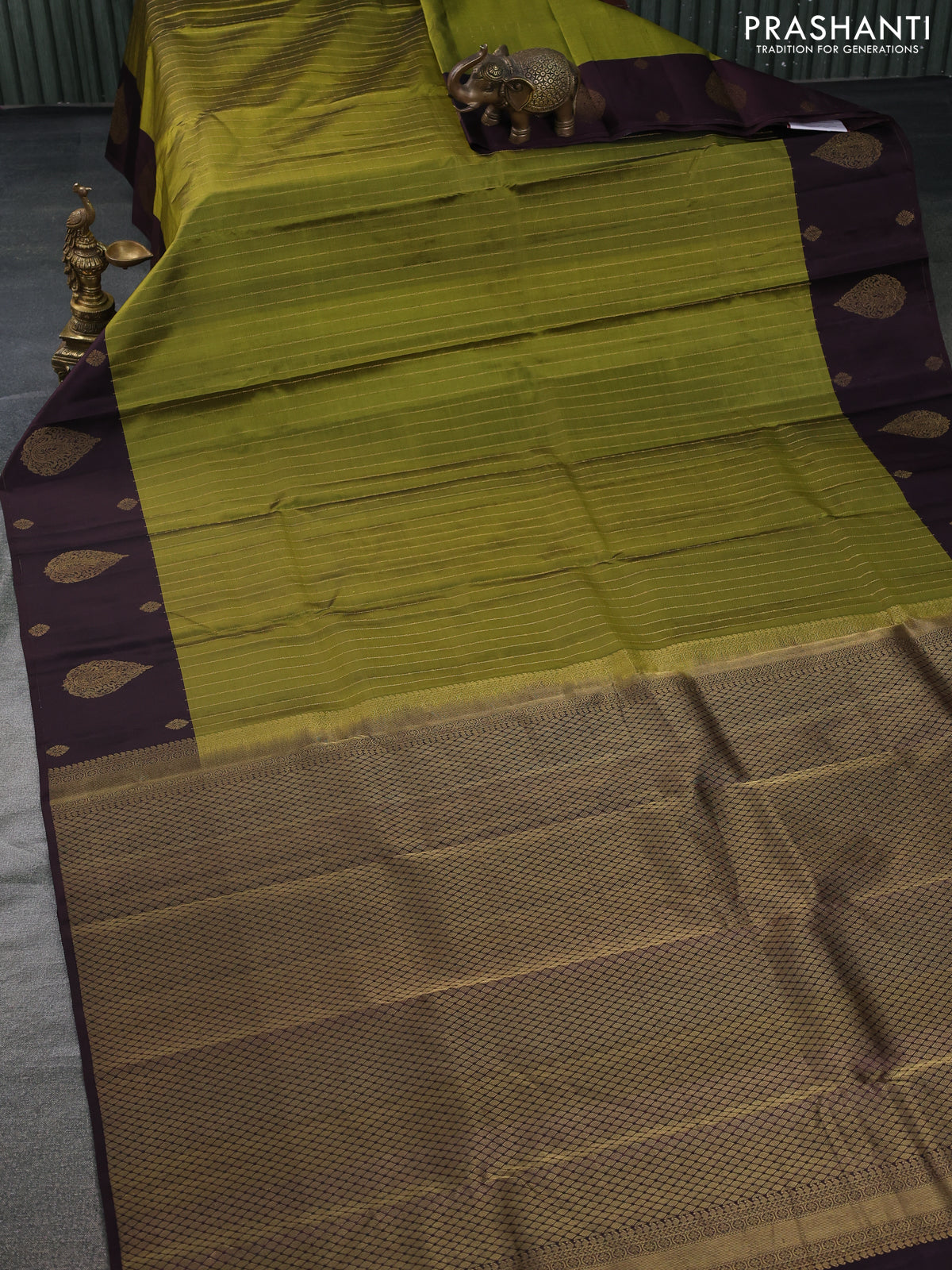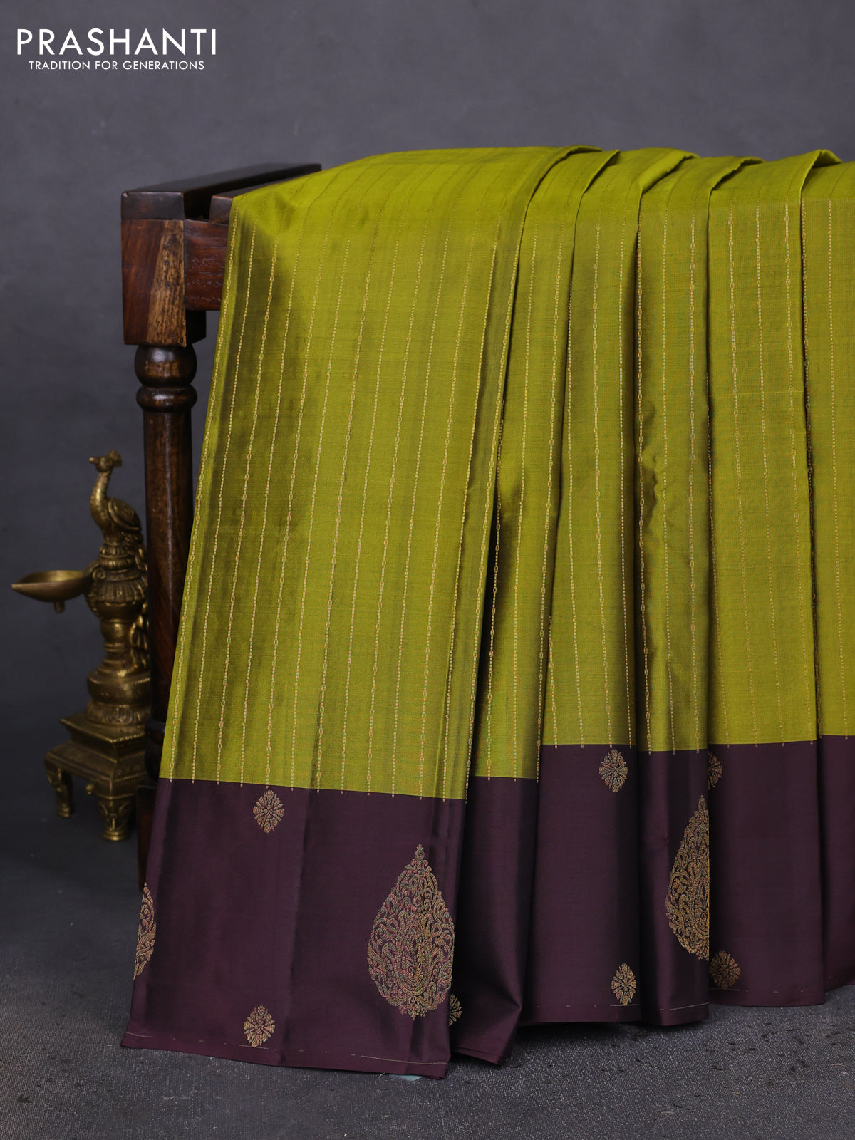 Pure kanchipuram silk saree mehendi green and wine shade with allover stripes pattern and zari woven butta border