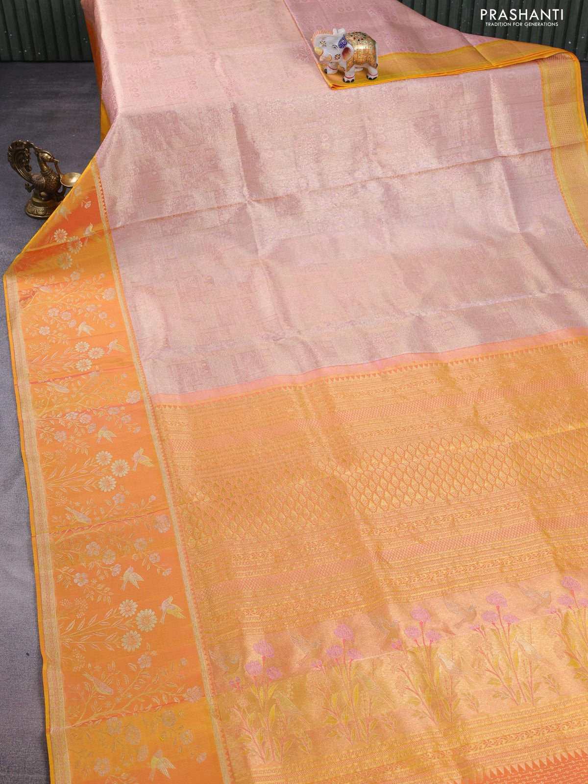 Pure kanchipuram silk saree mild peach and mustard yellow with allover zari woven brocade weaves and rich zari woven border