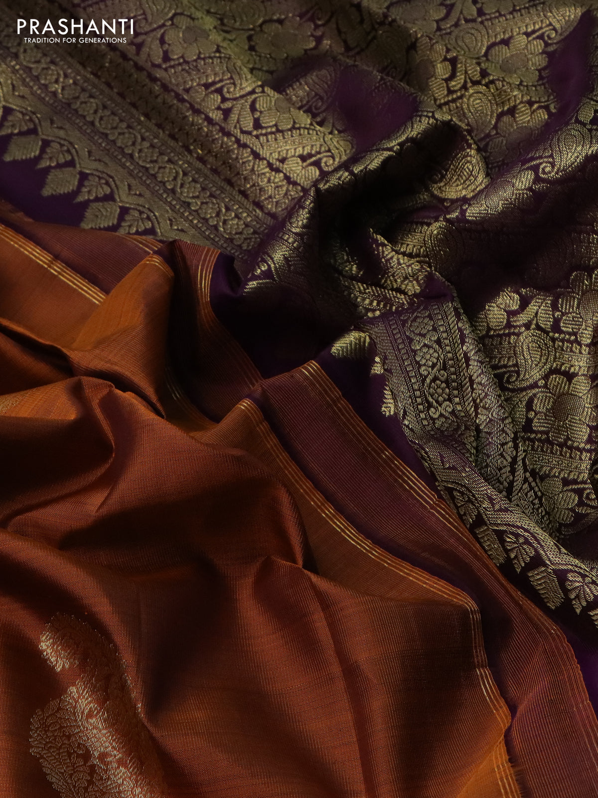 Pure kanchipuram silk saree mustard shade and deep violet with paisley zari woven buttas and long zari woven border