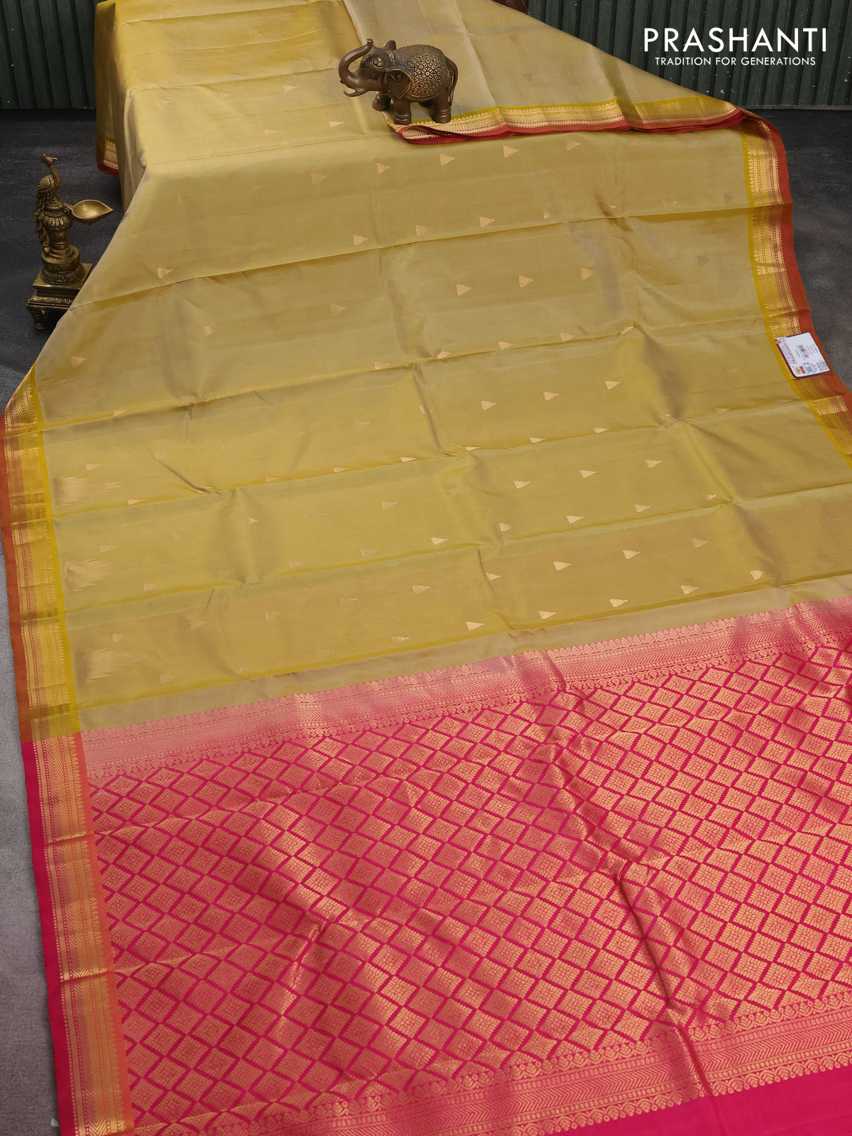 Pure kanchipuram silk saree mustard shade and pink with temple zari woven buttas and zari woven border