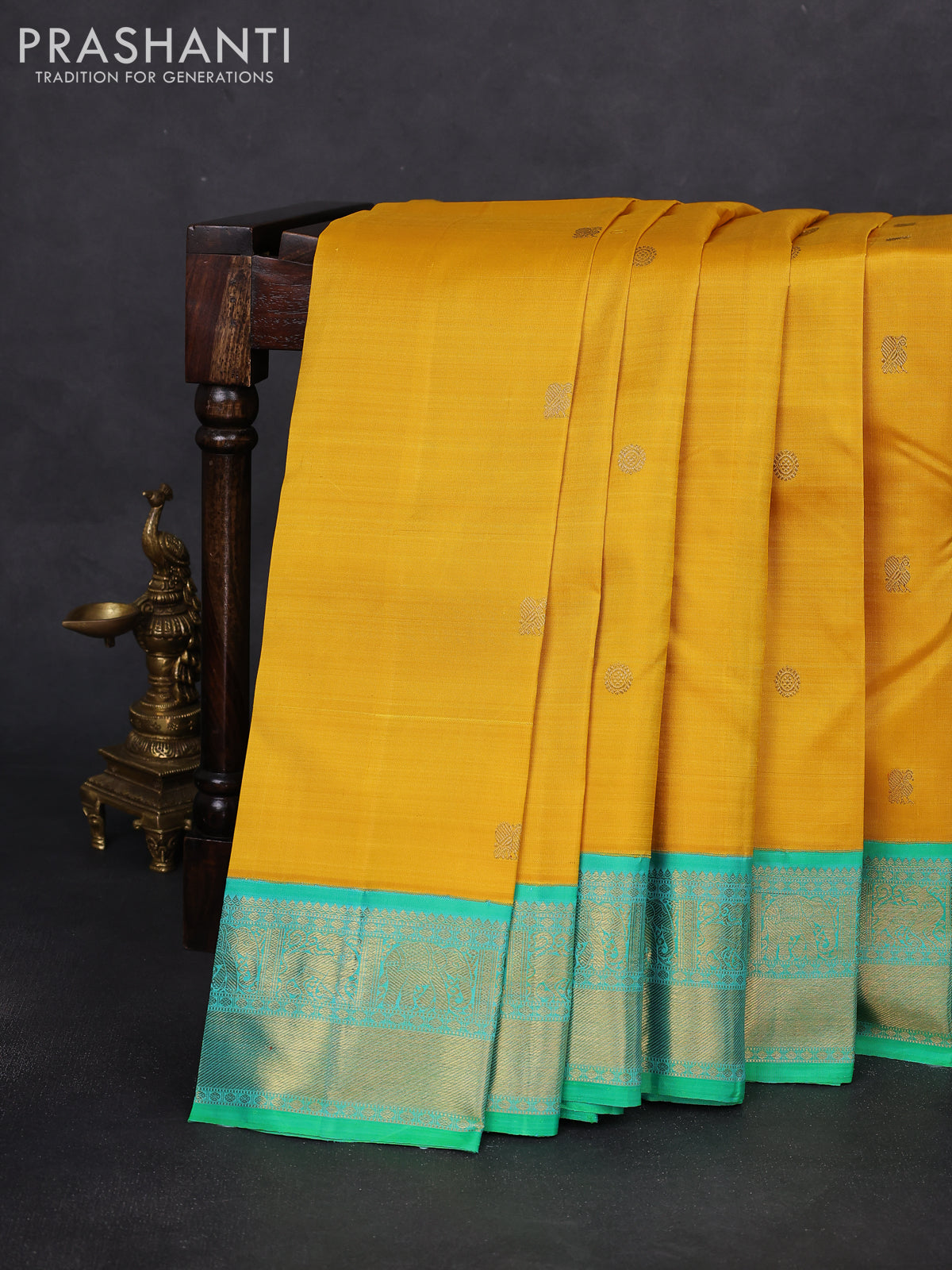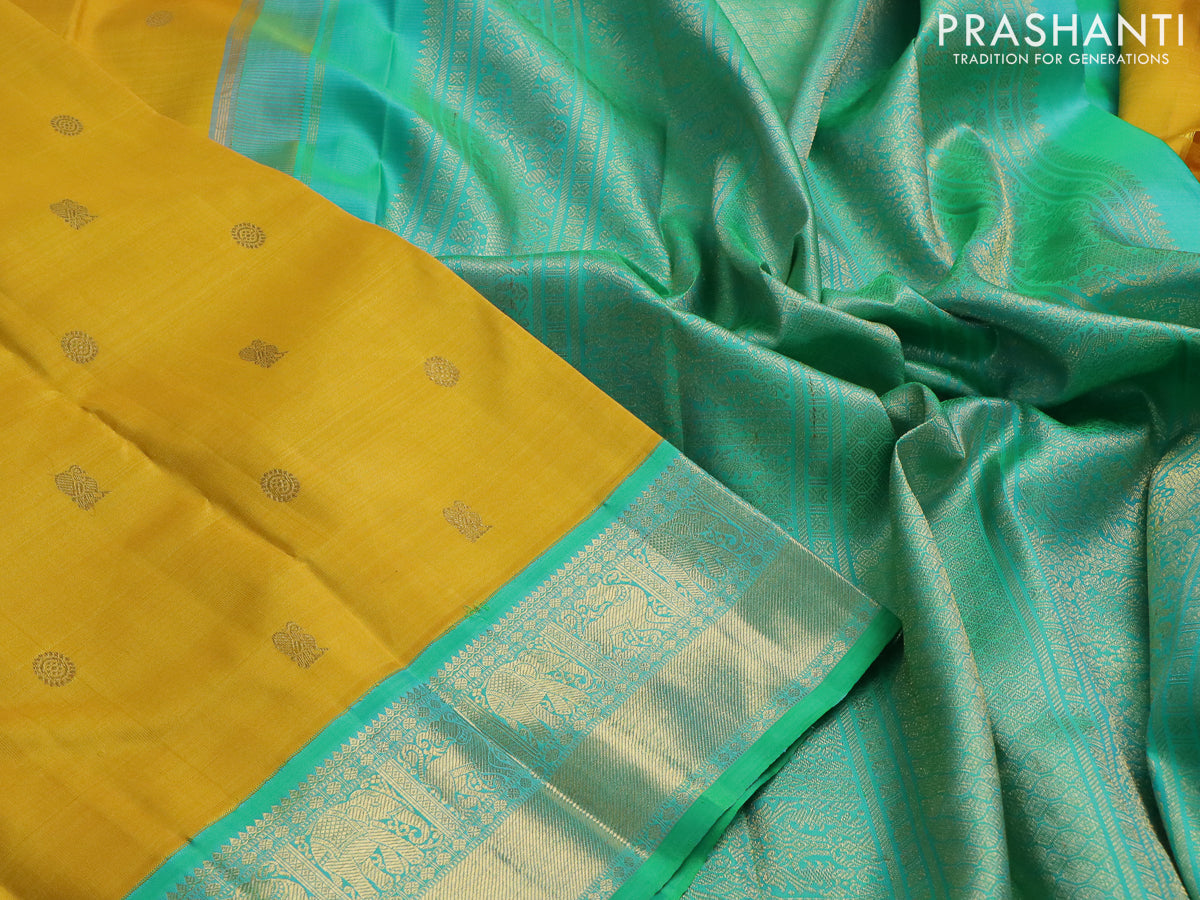 Pure kanchipuram silk saree mustard yellow and green with zari woven buttas and zari woven korvai border