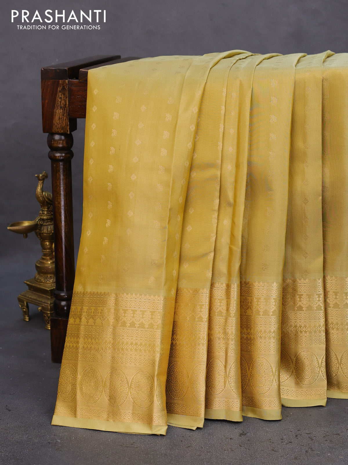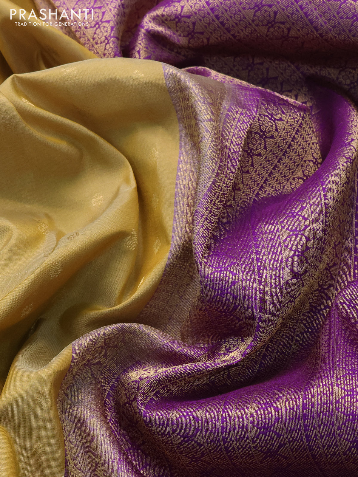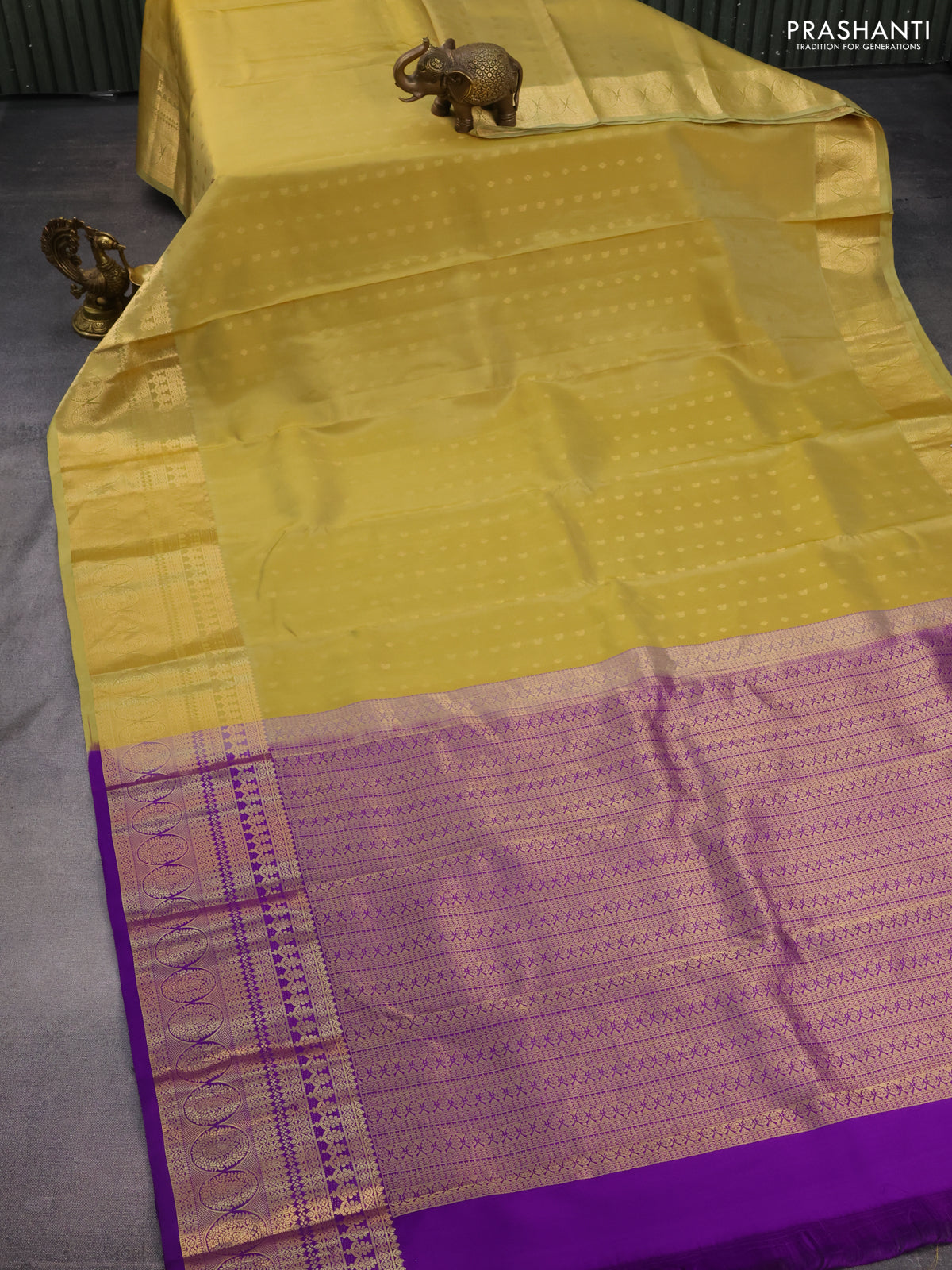 Pure kanchipuram silk saree pale yellow and violet with zari woven buttas and zari woven border