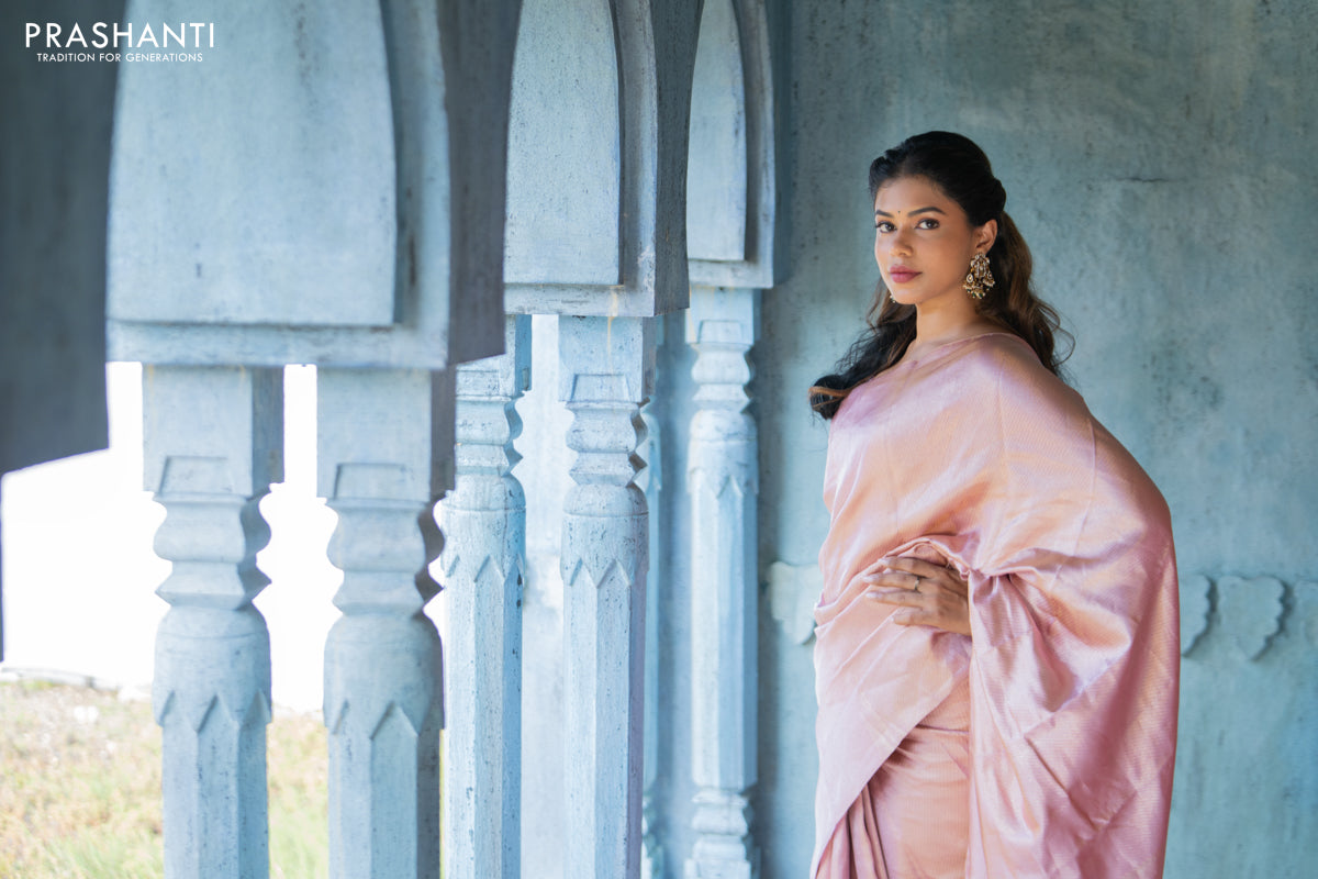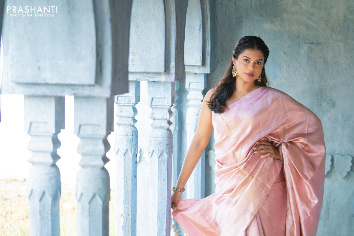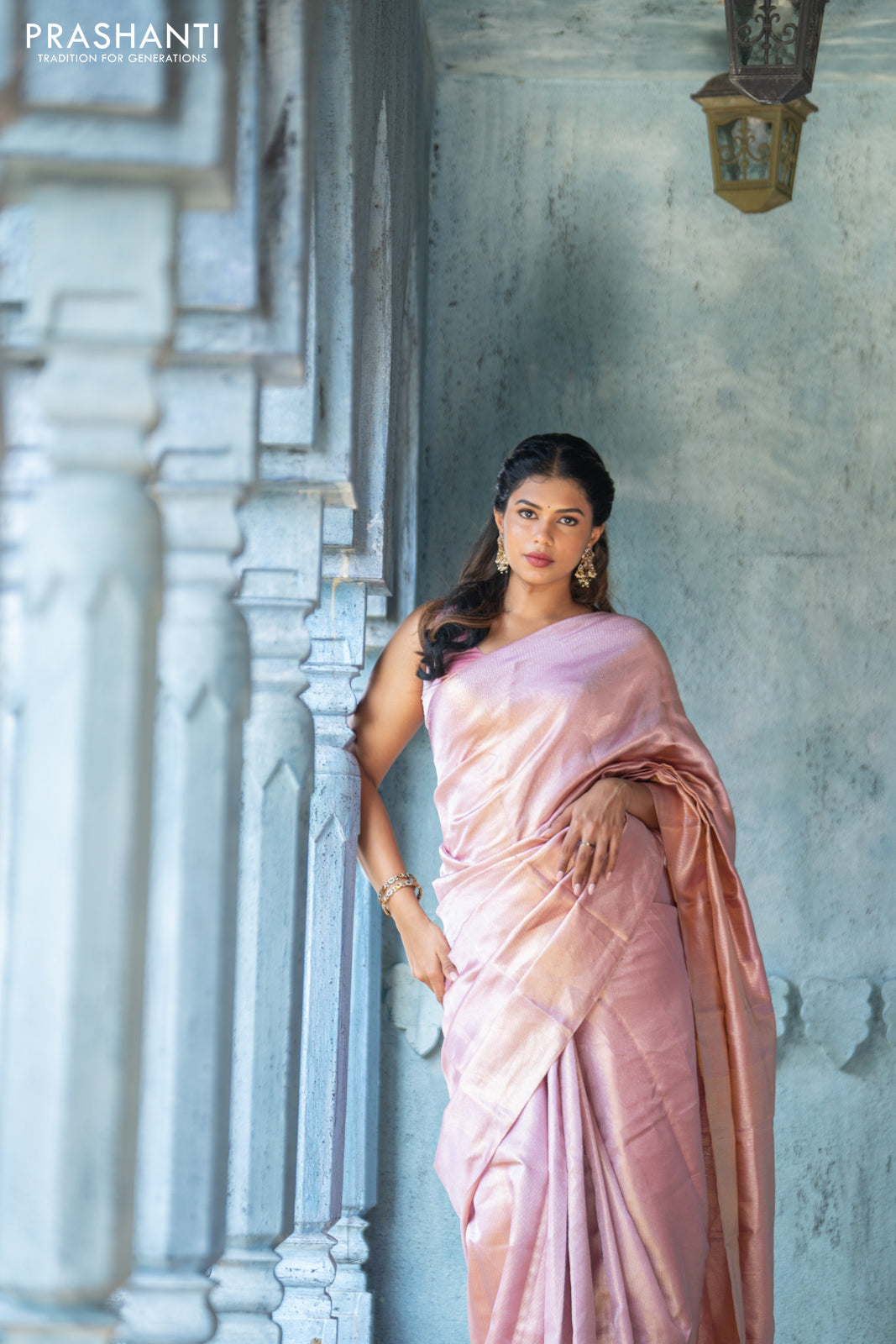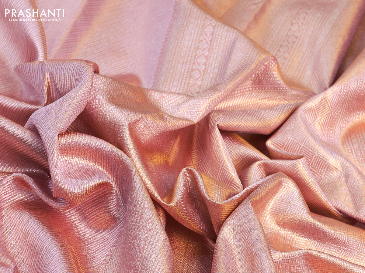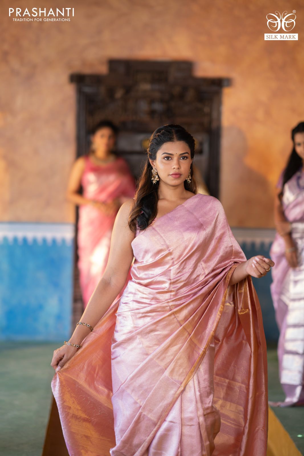 Pure kanchipuram silk saree pastel pink with allover silver zari woven brocade weaves in borderless style