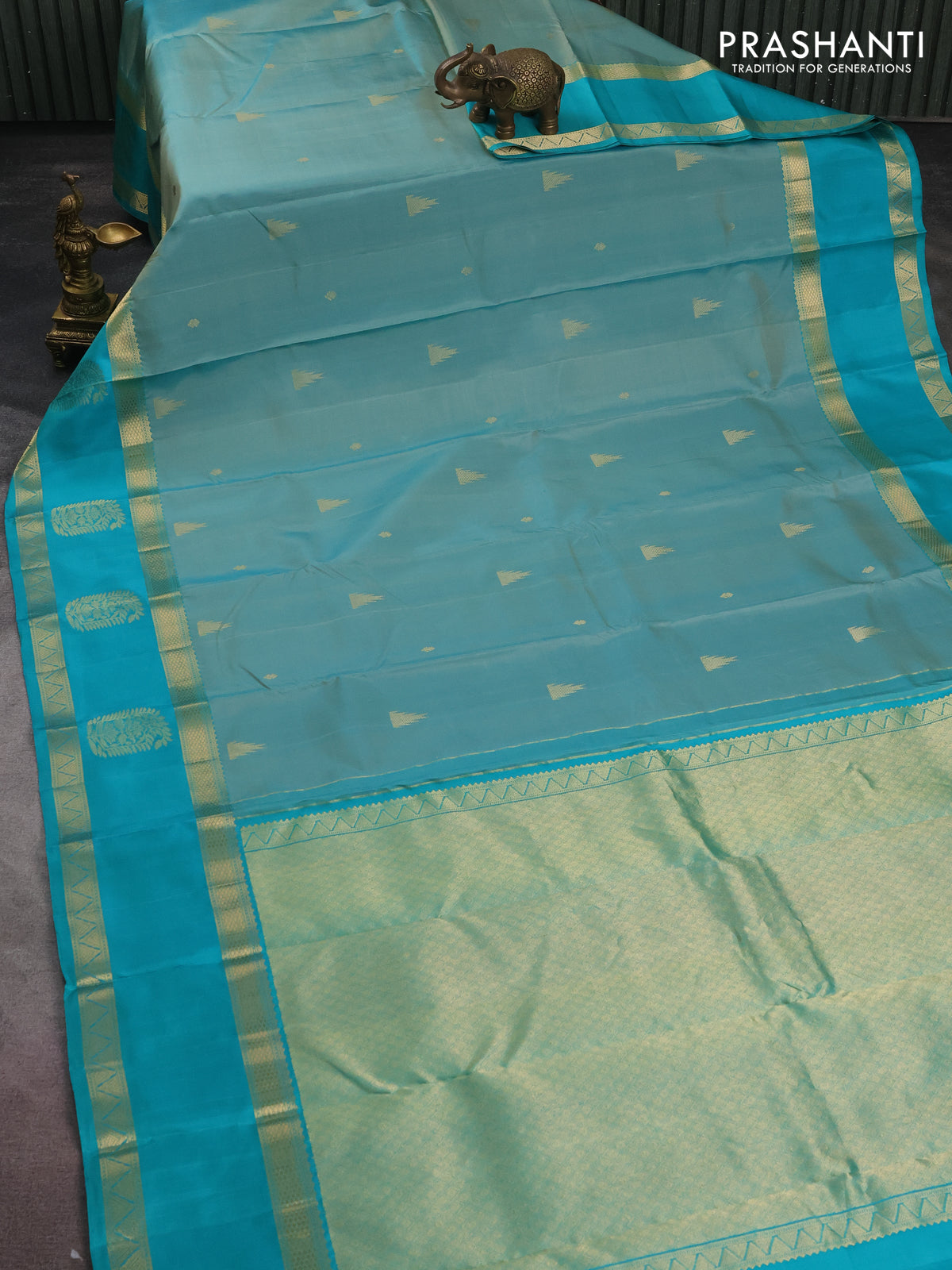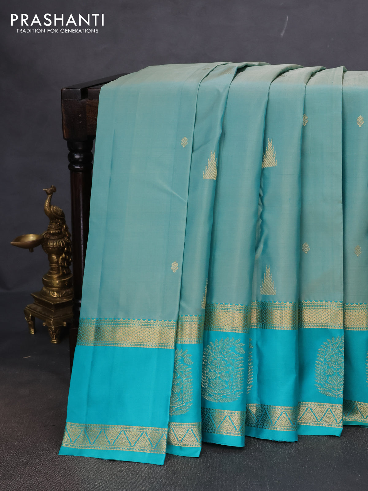 Pure kanchipuram silk saree pastel shade and teal blue with zari woven buttas and long zari woven butta border