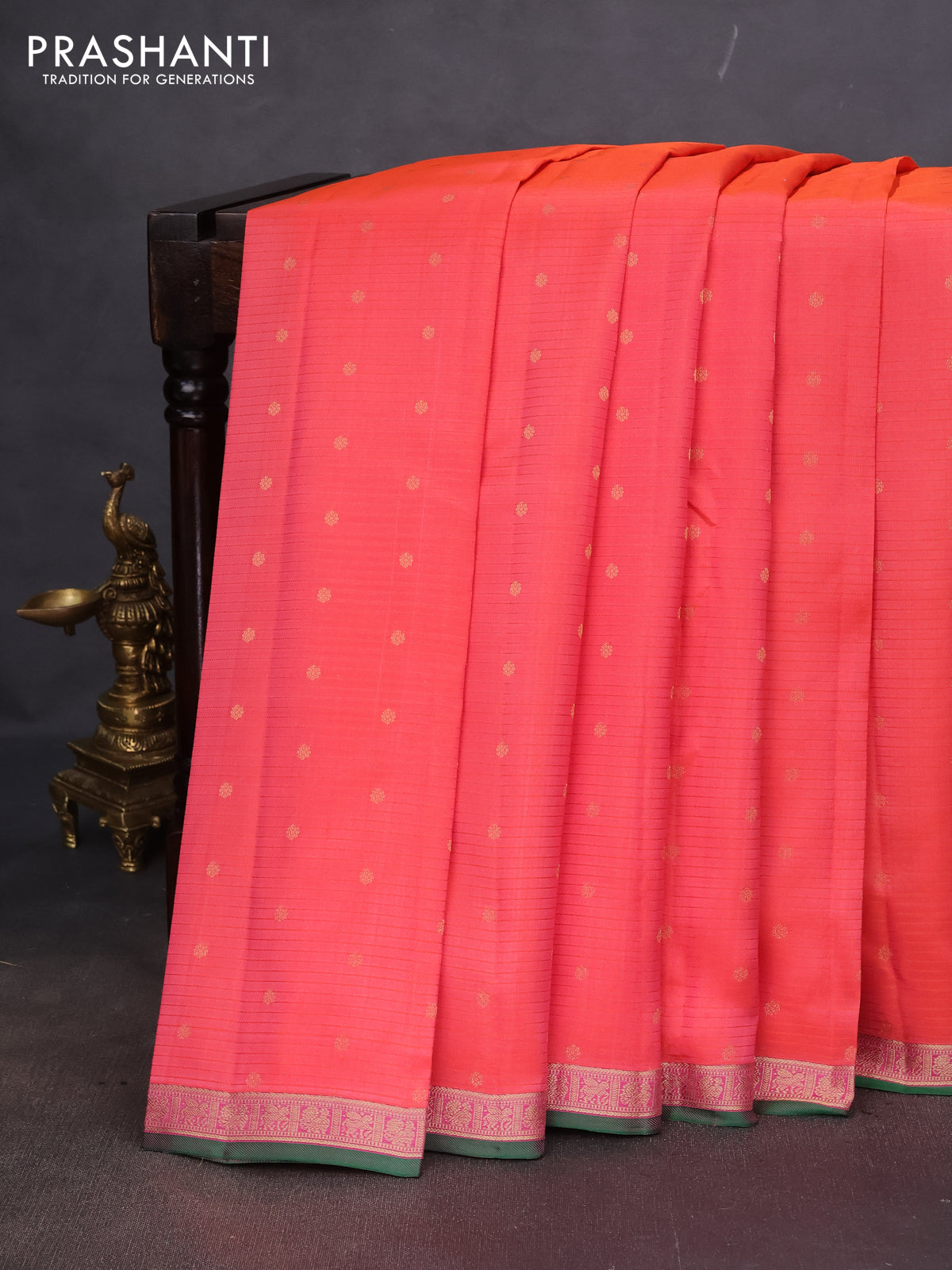 Pure kanchipuram silk saree peach orange and pink with allover stripe pattern & zari woven buttas and small zari woven border