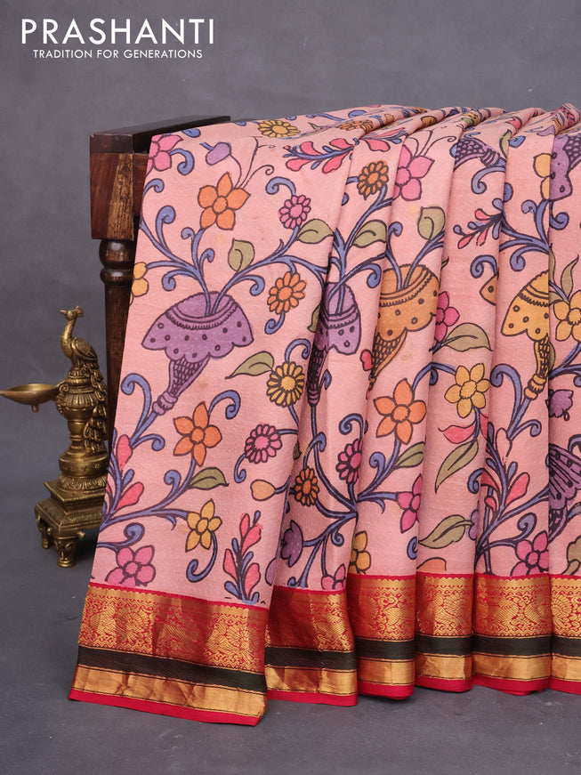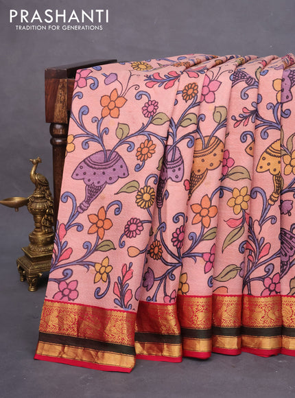Pure kanchipuram silk saree peach pink and pink with allover pen kalamkari prints & zari buttas and zari woven border