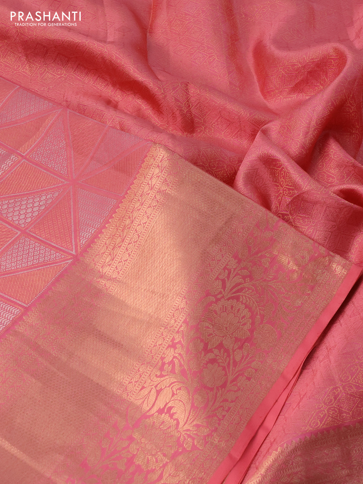 Pure kanchipuram silk saree peach pink with allover silver & gold zari woven geometric brocade weaves and long copper zari woven border